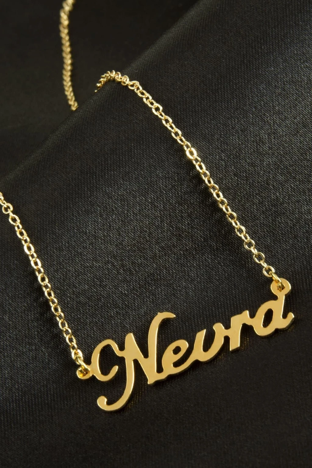 Nevra İsimli Kolye. İsimli kolye pirinç madeninden ve altın kaplamalıdır. Kişiye özel üretilmektedir.Yazdırmak istediğiniz ismi bize mesaj olarak iletmeniz gerekmektedir. Kullanıma bağlı olarak uzun süre kullanıma uygundur. Ürün malzemesi 1.sınıf kalitededir. Ürün ve zinciri sarı renktedir. Ürün zincir boyu 45 cm ve ürün üzerindeki isimler yaklaşık 3 cmdir. İsim boyları ürün ismine göre degişiklik göstermektedir.