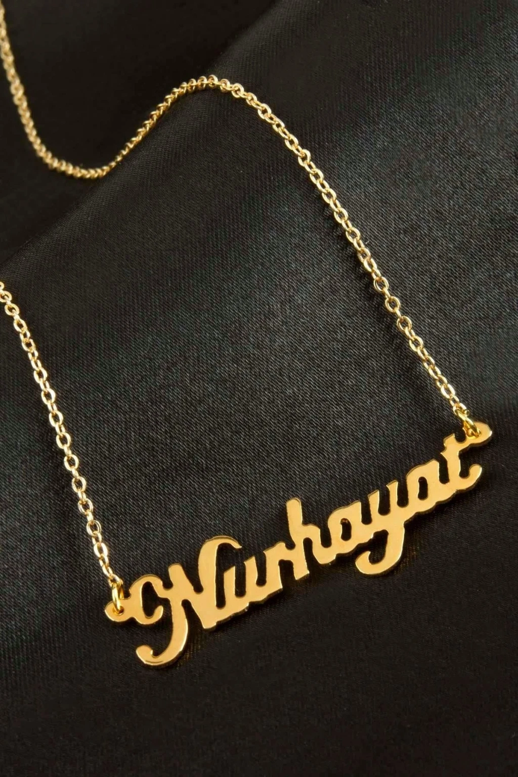 Nurhayat İsimli Kolye. İsimli kolye pirinç madeninden ve altın kaplamalıdır. Kişiye özel üretilmektedir.Yazdırmak istediğiniz ismi bize mesaj olarak iletmeniz gerekmektedir. Kullanıma bağlı olarak uzun süre kullanıma uygundur. Ürün malzemesi 1.sınıf kalitededir. Ürün ve zinciri sarı renktedir. Ürün zincir boyu 45 cm ve ürün üzerindeki isimler yaklaşık 3 cmdir. İsim boyları ürün ismine göre degişiklik göstermektedir.