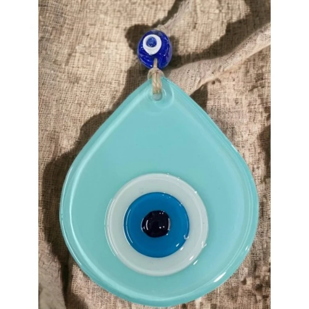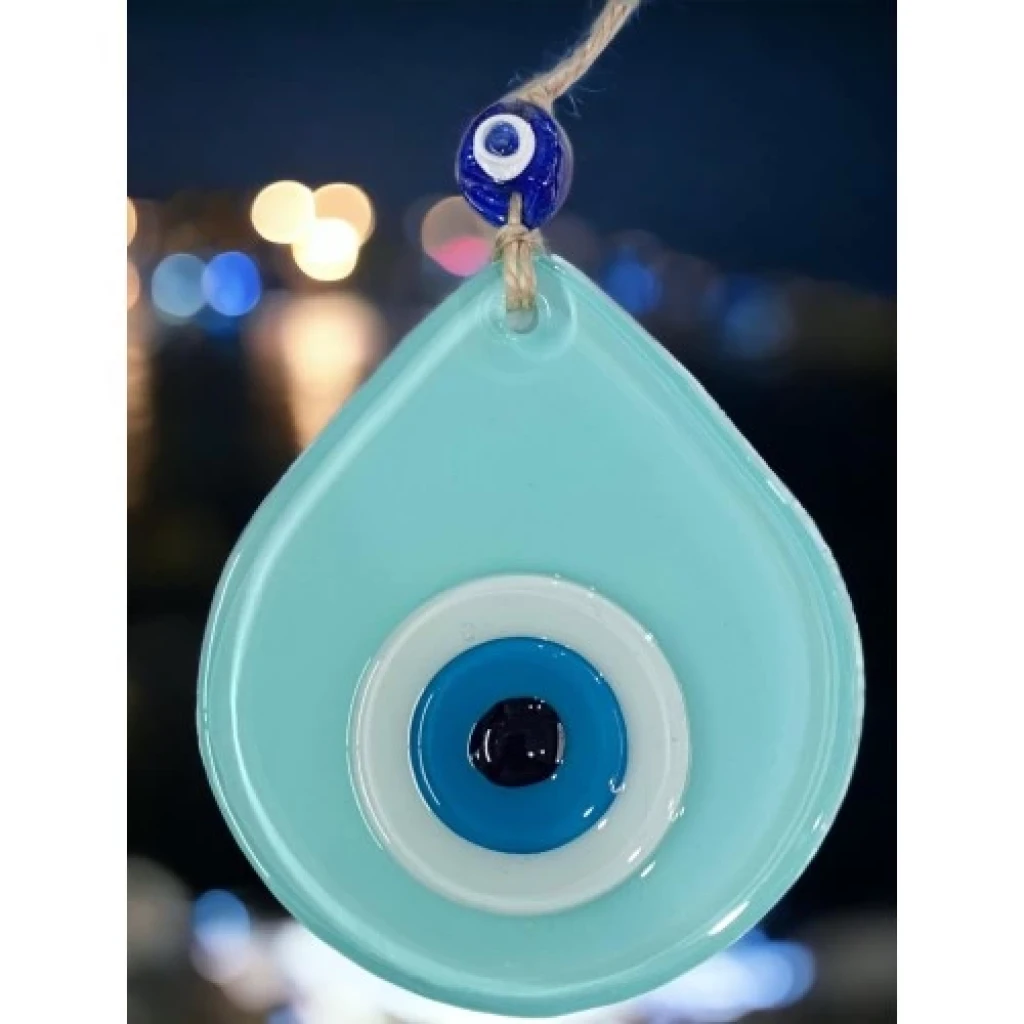 Mini turkuaz renk nazar boncuklu duvar süsümüz tamamen el işçiliği ile üretilmiştir. Tasarım harikası el yapımı nazar boncuklu duvar süsümüz 10 x 12 santimetre ölçülerindedir. Ürünümüz ip dahil 21 santimetre boyundadır.
