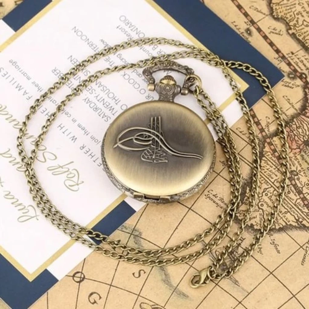 Osmanlı Tuğralı Köstekli SaatKöstekli saat kapağında bulunan Osmanlı Tuğrası ile saat eskitme antika görünüm ile dikkat çekmektedir.Osmanlı tuğrası motifi saat üzerinde farklı bir görünüme sahip olup hediye edeceğiniz kişiye osmanlı dönemini hatırlatacaktır.Tasarımı ve görünümü özenle üretilmiştir olan antika köstekli saat nostalji severle harika hediyelerden.Köstekli saat modeli Osmanlı Tuğrası üstünde olup saate farklı bir görünüm vermektedir.Nostalji antika saat sever sevdiklerinize verebileceğiniz antika köstekli saat çeşitlerinden.Köstekli saat zincirli olup istediğiniz yere asabilir veya zinciri çıkartıp cebinizde taşıyabilirsiniz.Metal Köstekli Saat Özellikleri:* Köstekli saat kaliteli metal malzemeden üretilmiştir.* Köstekli saat'in mekanizması 1.kalitedir.* Köstekli saat kapağında uluyan kurtlar bulunmaktadır.* Nostaljik antika hediyelik saattir.* Tasarım ve görünüm şıklığı.Saat Ölçüleri:Saat Çapı: 4.5 cm Zincir'in Çapı: 30 cm