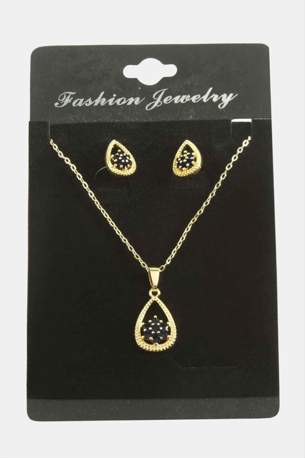 Kolye; Ürün malzemesi metal ve zirkon taştan üretilmiştir. 1 sınıf kaliteli malzeme kullanılmıştır. Ürün 1 adet kolye, ve 1 adet çift küpe vardır. Ürün zincir uzunluğu 45 santimdir. Ürün ucundaki taşlı aparat boyu 1,5 cmdir.