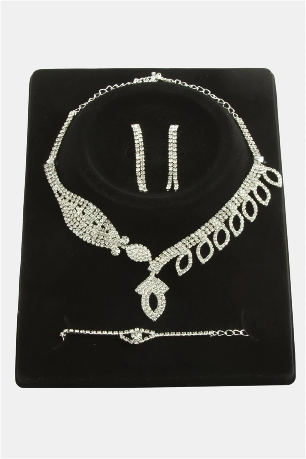 Set Kolye; Ürün malzemesi zirkon taştır. Ürün 1 sınıf kaliteli malzemeden üretilmiştir.Ürün kolye boyu 40 cm, bileklik boyu 18 cm ve küpe uzunluğu 4 cmdir. Kartlı ve paketiyle beraber gönderilecektir. Duş, deniz vb yerlerde kullanıma uygun degildir.