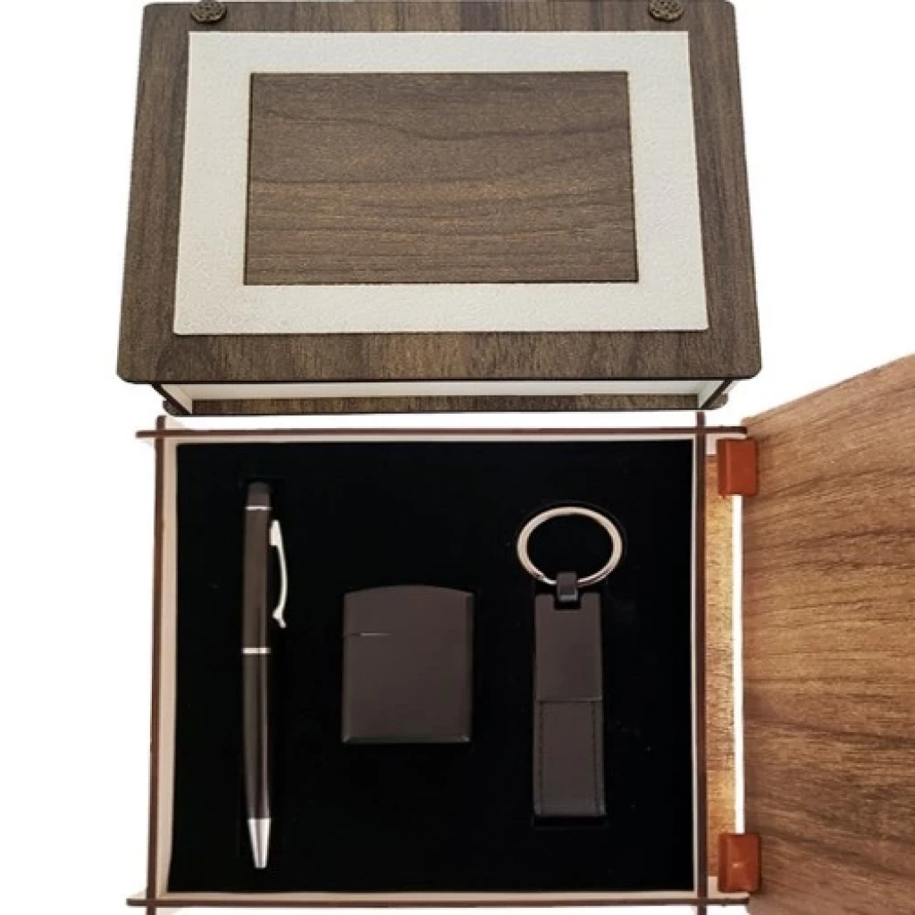 Özel Ahşap Kutulu Mat Siyah Kalem Anahtarlık ve Çakmak Set