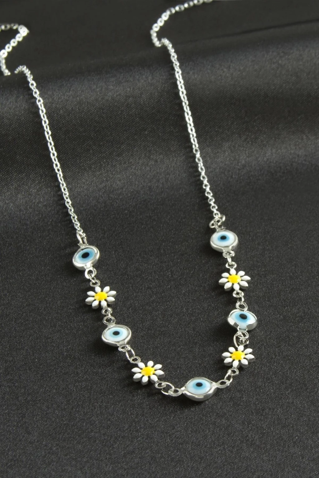 Kolye; Ürün malzemesi metal ve mine boyamadır. Ürün zincir uzunluğu 45 cmdir. Kartlıdır. Nazar boyu 0,5 mm dir.