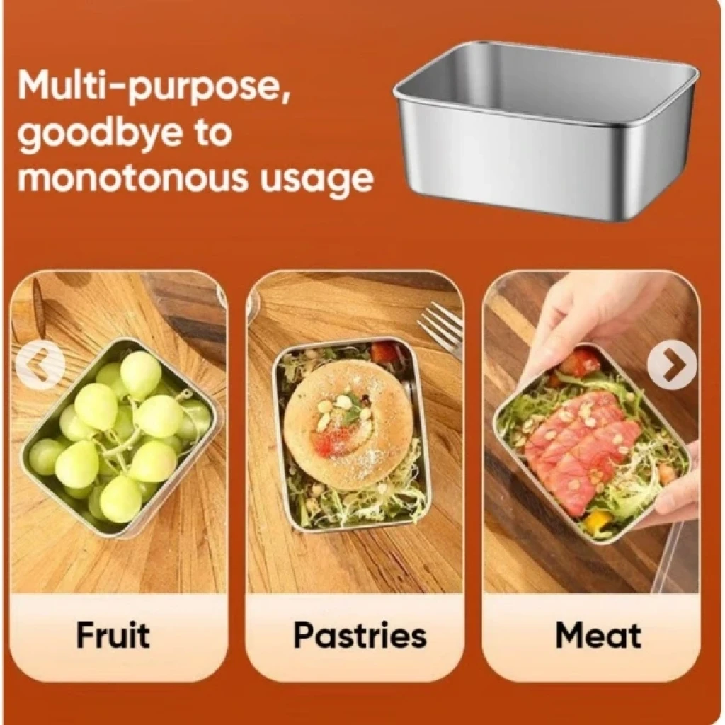 PASLANMAZ ÇELİK SAKLAMA KABIÜrün ÖzellikleriPaslanmaz çelik saklama kabı, dayanıklı ve şık tasarımıyla uzun ömürlü kullanım sağlar. Bu kabın boyutları 13.5 cm x 10.5 cm x 5 cm olup, çeşitli mutfak gereçleri ve gıda saklama ihtiyaçları için idealdir. Paslanmaz çelik malzeme, koku geçirmez ve gıda güvenliği sağlar, ayrıca kolayca temizlenebilir ve dayanıklıdır. Hem evde hem de ticari kullanımlar için mükemmel bir tercihtir.Paket İçeriği1 Adet Paslanmaz Çelik Saklama Kabı