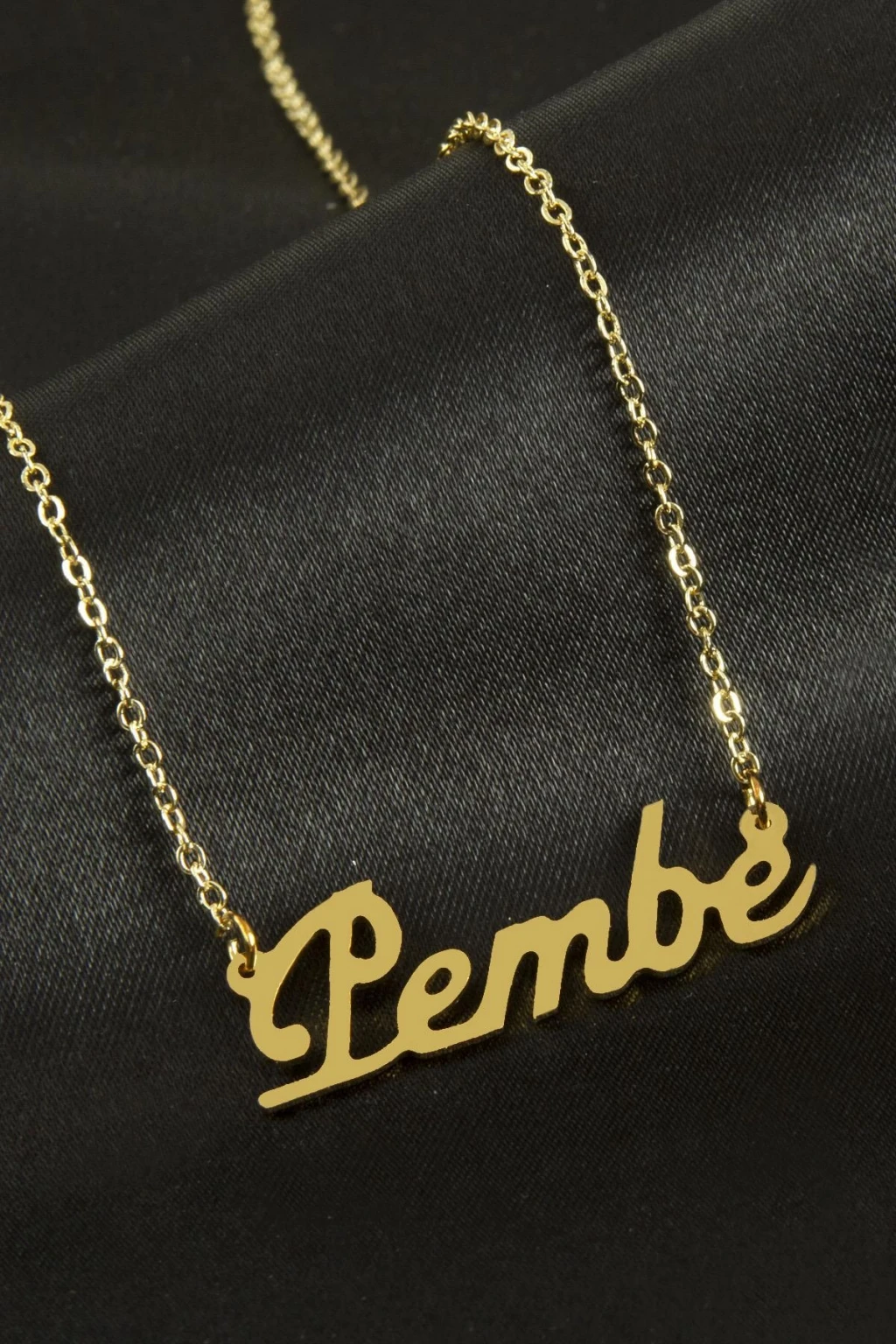 Pembe İsimli Kolye. İsimli kolye pirinç madeninden ve altın kaplamalıdır. Kişiye özel üretilmektedir.Yazdırmak istediğiniz ismi bize mesaj olarak iletmeniz gerekmektedir. Kullanıma bağlı olarak uzun süre kullanıma uygundur. Ürün malzemesi 1.sınıf kalitededir. Ürün ve zinciri sarı renktedir. Ürün zincir boyu 45 cm ve ürün üzerindeki isimler yaklaşık 3 cmdir. İsim boyları ürün ismine göre degişiklik göstermektedir.