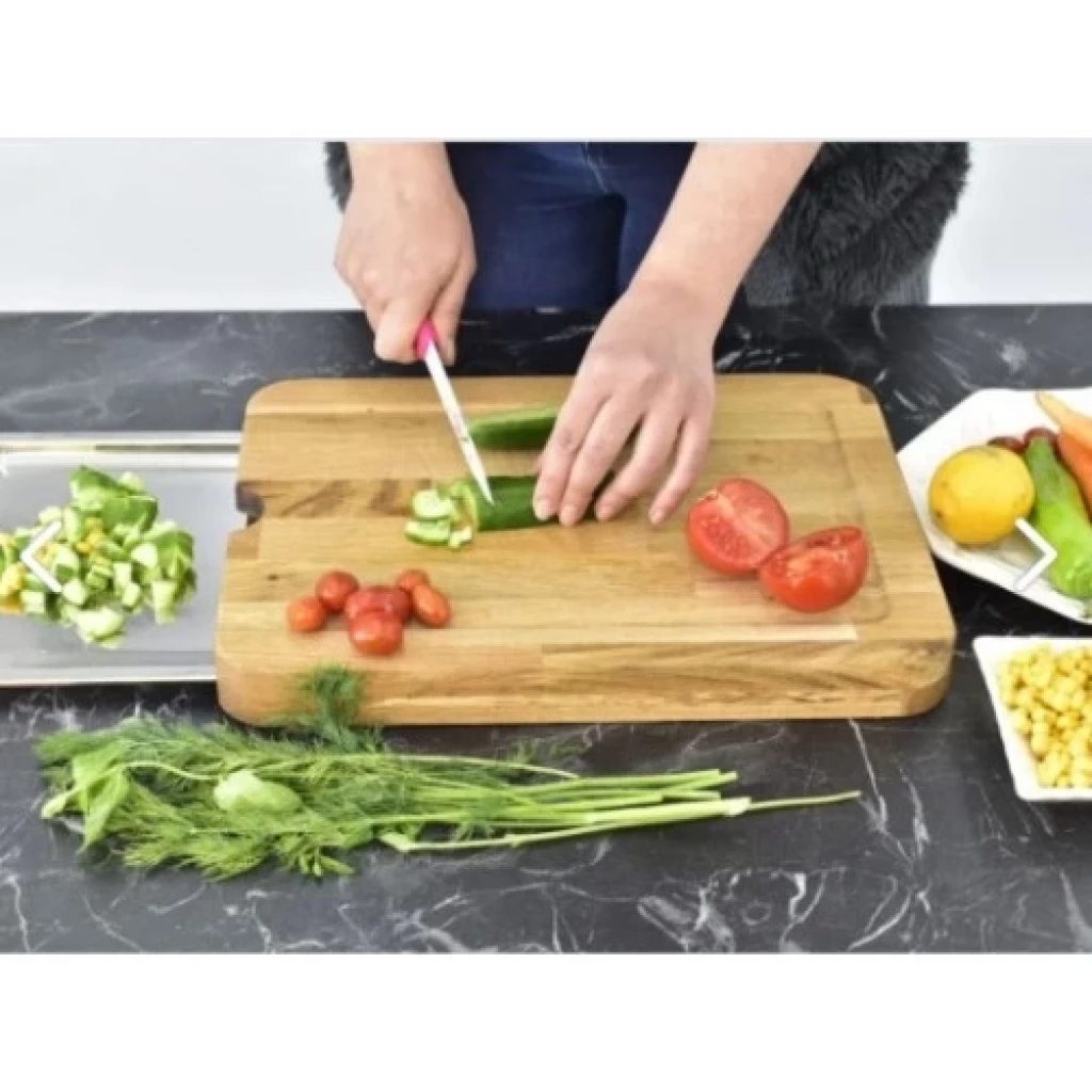 Ürün Açıklaması:Mutfaktaki en büyük yardımcınız olacak bu pratik ahşap kesme tahtası, gıda hazırlığını kolaylaştıran tasarımıyla dikkat çeker. Yanda yer alan metal tepsisi sayesinde doğradığınız malzemeleri hızlıca bir araya getirebilir, tezgahınızı temiz tutabilirsiniz. Sağlam ve hijyenik ahşap malzemesi, yiyeceklerle güvenle temas ederken uzun ömürlü kullanım sağlar.Kaliteli Malzeme: Doğal ahşaptan üretilmiştir, dayanıklıdır ve uzun süreli kullanım sağlar.Pratik Tepsi: Yan tarafında yer alan paslanmaz çelik tepsi, doğradığınız malzemeleri kolayca ayırmanıza yardımcı olur.Geniş Yüzey: Büyük boyutlu yüzeyi ile geniş bir çalışma alanı sunar.Kolay Temizlenir: Ahşap yüzeyi temizlenmesi kolaydır ve hijyeniktir.