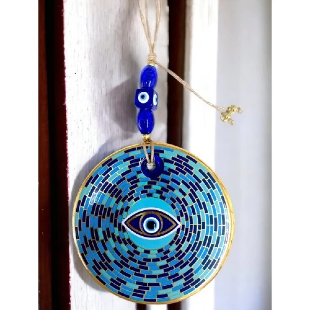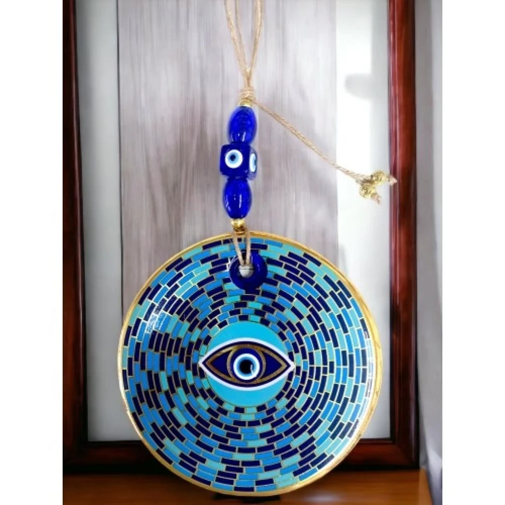 Nazar boncuklu göz duvar süsümüz nazar boncuğu ile süslenmiştir. Ürünümüz mavi cam nazar boncuğundan tamamen el işçiliği ile üretilmiştir. Ürünümüzün yuvarlak kısmı 13 santimetre çapındadır. Duvar süsümüz ip dahil yaklaşık 30 santimetre boyundadır.