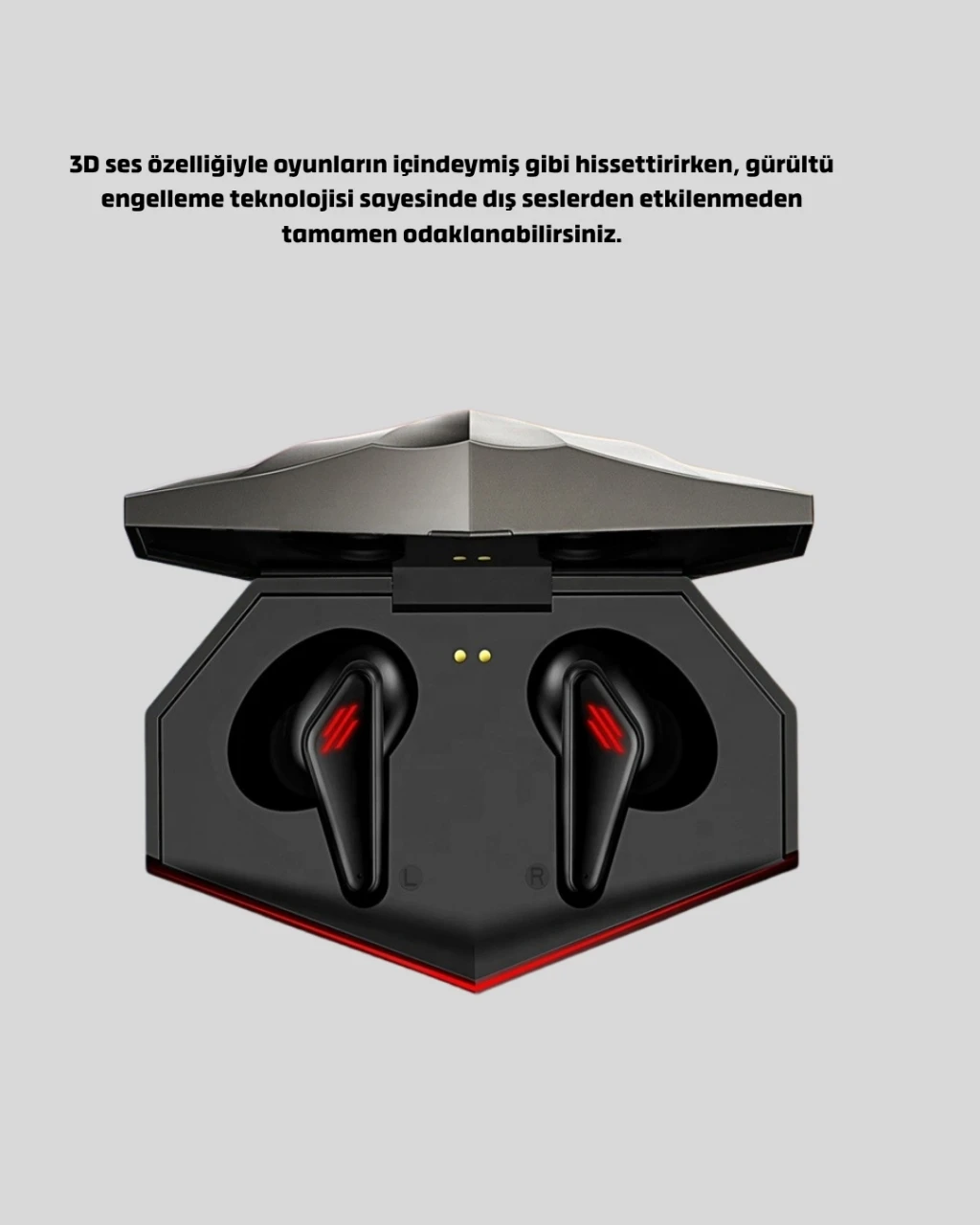 Her saniyenin önemli olduğu oyunlarda fark yaratın! Bu oyuncu kulaklığı, 45 ms ultra düşük gecikme teknolojisi sayesinde sesin ekrandaki aksiyonla mükemmel şekilde senkronize olmasını sağlar.3D ses deneyimi, oyundaki her hareketi, yönü ve mesafeyi algılamanıza yardımcı olur; sanki sanal dünyanın içindeymişsiniz gibi hissedersiniz.Gürültü engelleme sistemi, dış ortam seslerini filtreleyerek maksimum odaklanma sağlar. Güçlü Bluetooth 5.0 bağlantısı, 10 metreye kadar kesintisiz iletişim sunar ve Android, iOS, bilgisayar gibi farklı cihazlarla tam uyumludur.Ergonomik silikon yapısı, uzun oyun seanslarında kulak konforunu korur. 90° açılı kulaklık tasarımı, kulak içine tam oturur ve düşme riskini ortadan kaldırır.Ayrıca LED ışıklı modern tasarımı, hem tarzınıza hem de oyun atmosferine enerji katar.Dahili mikrofonu sayesinde takım arkadaşlarınızla kesintisiz, net .Hem oyun hem müzik için optimize edilmiş bu kulaklık; yüksek performans, konfor ve stil arayan herkesin favorisi olacak.