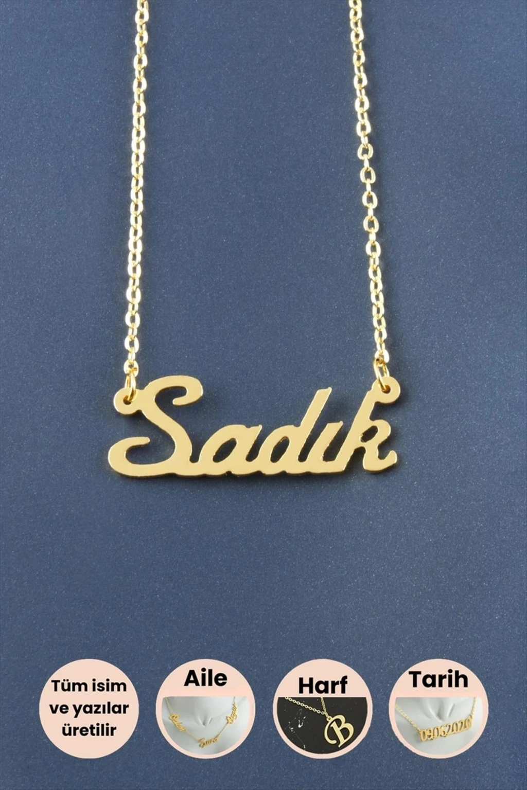 Sadık İsimli Kolye; İsimli kolye pirinç madeninden ve altın kaplamalıdır. Kişiye özel üretilmektedir. Yazdırmak istediğiniz ismi bize mesaj olarak iletmeniz gerekmektedir. Kullanıma bağlı olarak uzun süre kullanıma uygundur. Ürün malzemesi 1.sınıf kalitededir. Ürün ve zinciri sarı renktedir. Ürün zincir boyu 45 cm ve ürün üzerindeki isimler yaklaşık 3 cmdir. İsim boyları ürün ismine göre degişiklik göstermektedir.