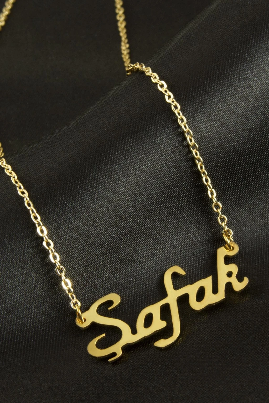 Şafak İsimli Kolye. İsimli kolye pirinç madeninden ve altın kaplamalıdır. Kişiye özel üretilmektedir.Yazdırmak istediğiniz ismi bize mesaj olarak iletmeniz gerekmektedir. Kullanıma bağlı olarak uzun süre kullanıma uygundur. Ürün malzemesi 1.sınıf kalitededir. Ürün ve zinciri sarı renktedir. Ürün zincir boyu 45 cm ve ürün üzerindeki isimler yaklaşık 3 cmdir. İsim boyları ürün ismine göre degişiklik göstermektedir.
