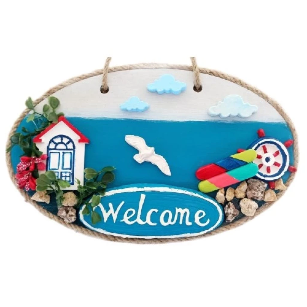 Sahil kasabası modeli ürünümüz welcome yazılıdır. Ürünümüz 26 cm eninde, 16 cm boyundadır. Kapı süsümüz 3 mm kalınlığında MDF zemin üzerine üretilmektedir. Kapı süsümüz el boyaması objeleri de dahil tamamen el işçiliği ile üretilmiştir.
