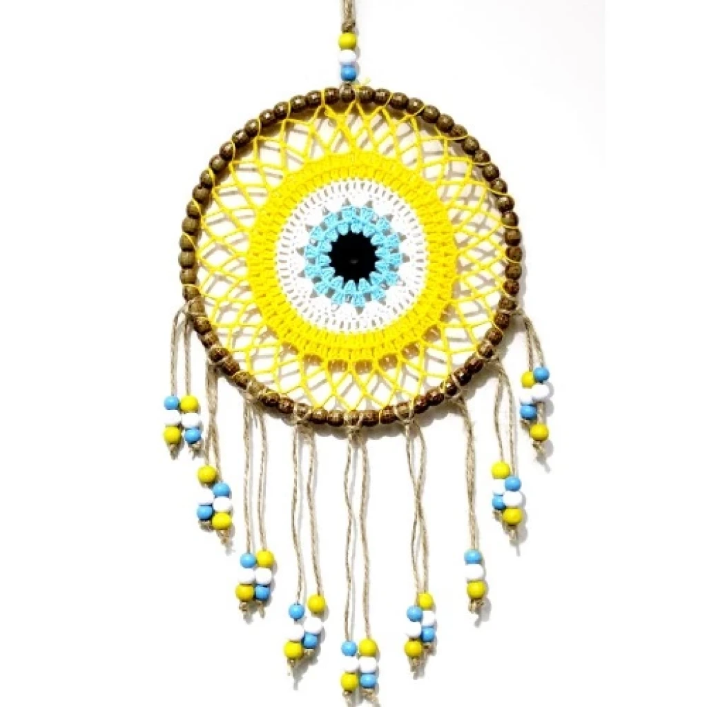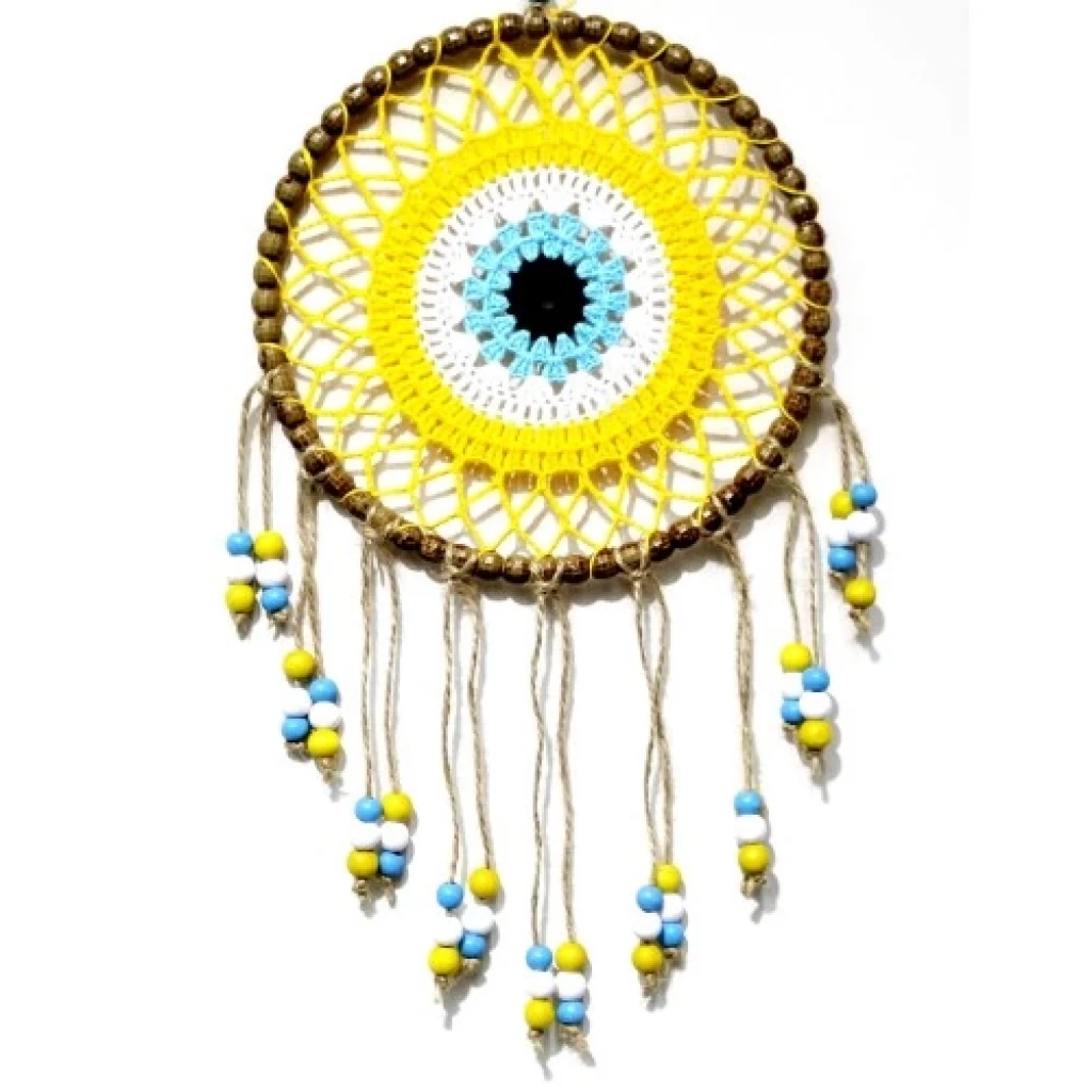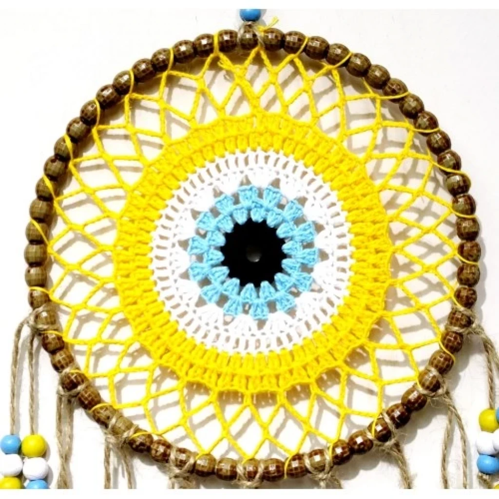 Sarı örgülü duvar süsümüz el yapımıdır. Ürünümüzde birinci kalite malzeme kullanılmaktadır. Ürünümüzün yuvarlak kısmı 21 santimetre çapındadır. Ürünümüz ip dahil 58 santimetre boyundadır. Ürünümüz renkli boncuklarla süslenmiştir.