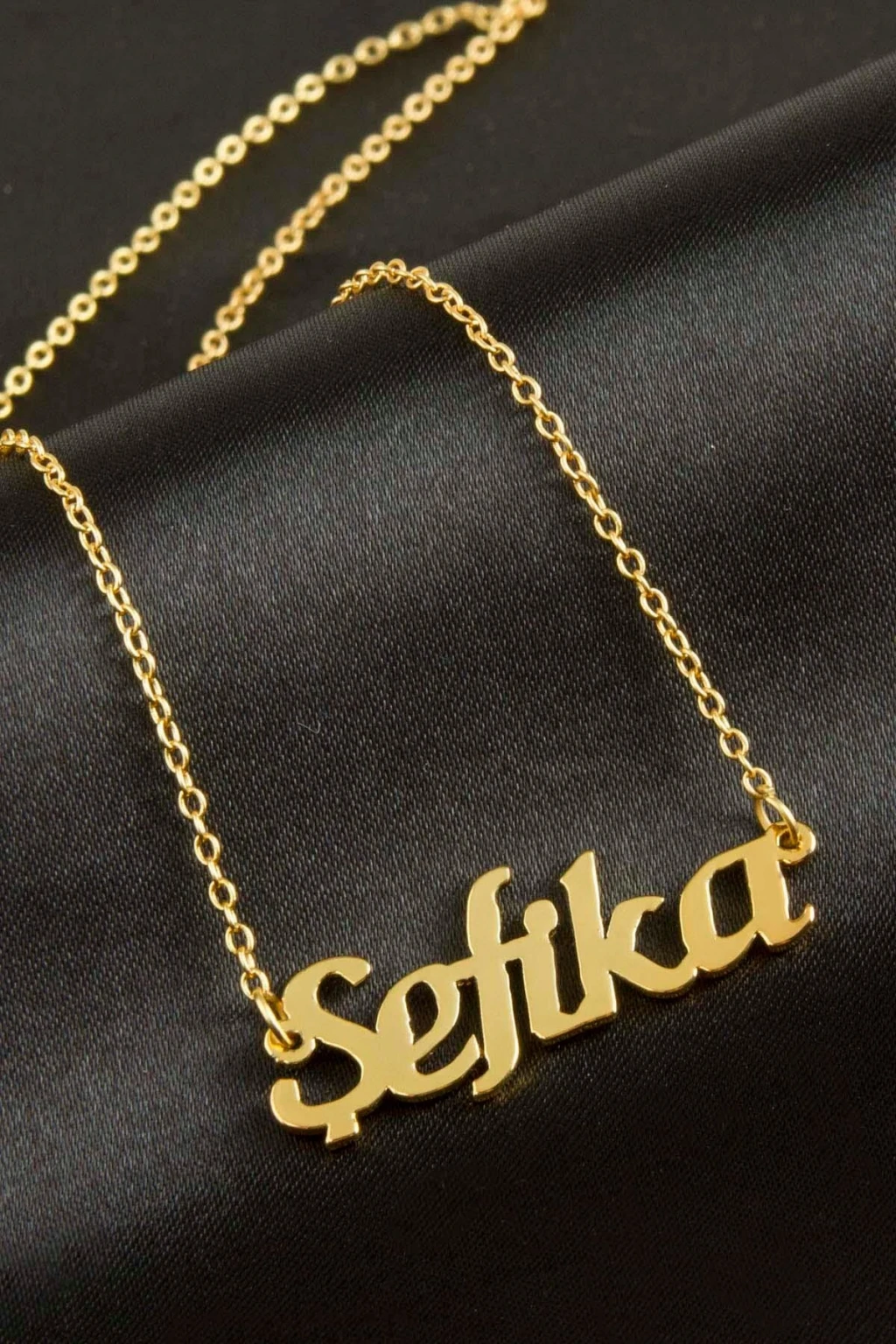 Şefika isimli kolye. İsimli kolye pirinç madeninden ve altın kaplamalıdır. Kişiye özel üretilmektedir.Yazdırmak istediğiniz ismi bize mesaj olarak iletmeniz gerekmektedir. Kullanıma bağlı olarak uzun süre kullanıma uygundur. Ürün malzemesi 1.sınıf kalitededir. Ürün ve zinciri sarı renktedir. Ürün zincir boyu 45 cm ve ürün üzerindeki isimler yaklaşık 3 cmdir. İsim boyları ürün ismine göre degişiklik göstermektedir.