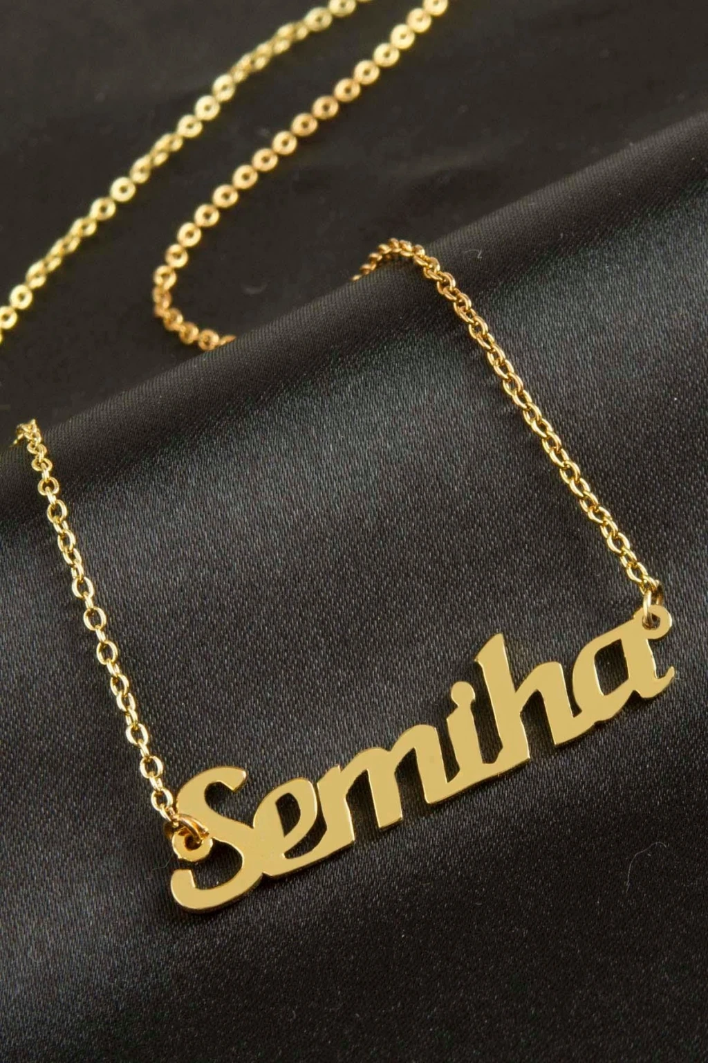 Semiha isimli kolye. İsimli kolye pirinç madeninden ve altın kaplamalıdır. Kişiye özel üretilmektedir.Yazdırmak istediğiniz ismi bize mesaj olarak iletmeniz gerekmektedir. Kullanıma bağlı olarak uzun süre kullanıma uygundur. Ürün malzemesi 1.sınıf kalitededir. Ürün ve zinciri sarı renktedir. Ürün zincir boyu 45 cm ve ürün üzerindeki isimler yaklaşık 3 cmdir. İsim boyları ürün ismine göre degişiklik göstermektedir.