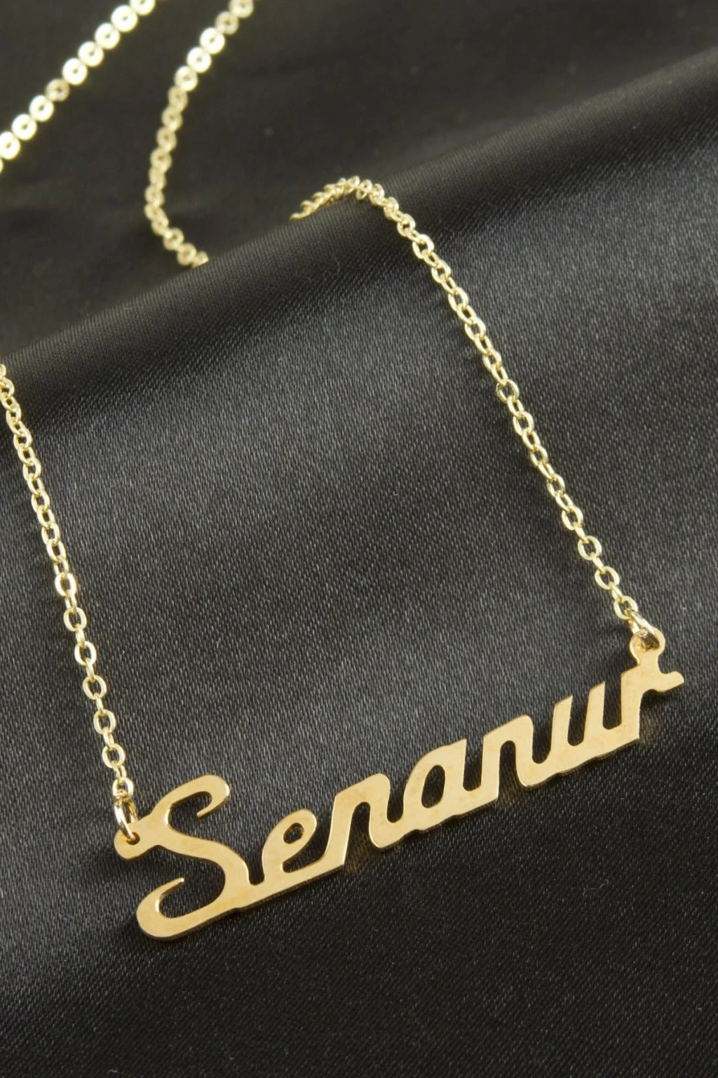 Senanur İsimli Kolye. İsimli kolye pirinç madeninden ve altın kaplamalıdır. Kişiye özel üretilmektedir.Yazdırmak istediğiniz ismi bize mesaj olarak iletmeniz gerekmektedir. Kullanıma bağlı olarak uzun süre kullanıma uygundur. Ürün malzemesi 1.sınıf kalitededir. Ürün ve zinciri sarı renktedir. Ürün zincir boyu 45 cm ve ürün üzerindeki isimler yaklaşık 3 cmdir. İsim boyları ürün ismine göre degişiklik göstermektedir.