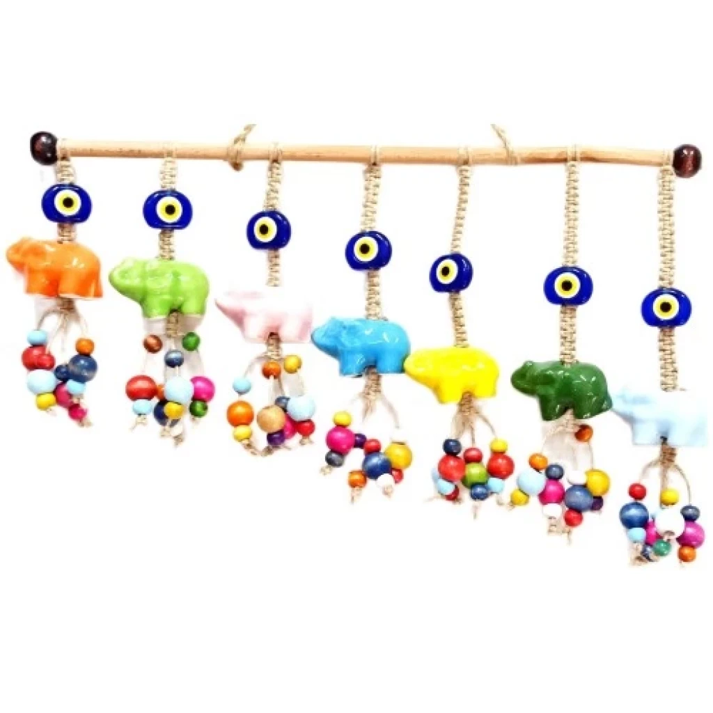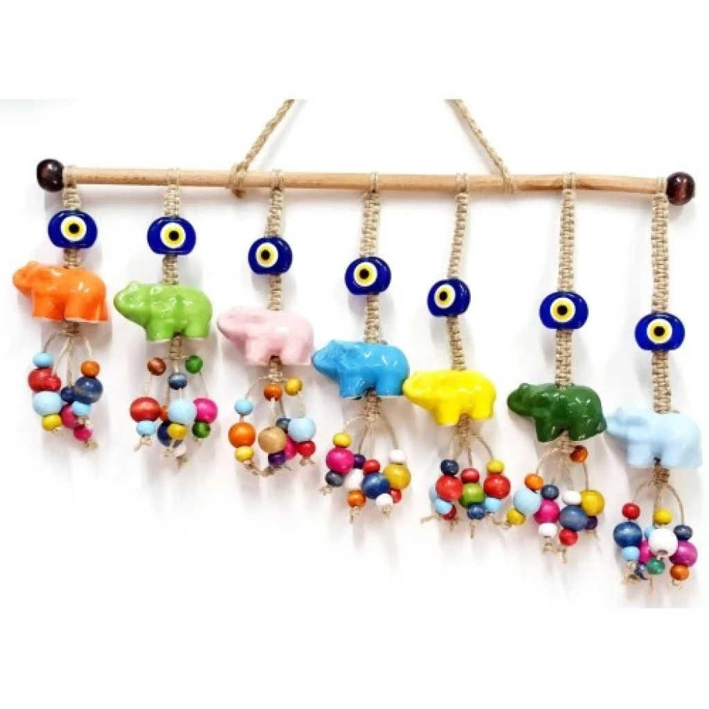 Yedi adet rengarenk seramik fil figürlü nazar boncuklu rengarenk tahta boncuk detaylı kapı, duvar, balkon ve bahçe süsümüz yaşadığı ortamda tarzıyla fark edilmek isteyenler için özel tasarım olarak el işçiliği ile üretilmiştir. Ürünümüz 38 cm eninde 30 cm uzunluğundadır. İster kendiniz için isterseniz sevdiklerinize hediye etmek için tercih edebilirsiniz.