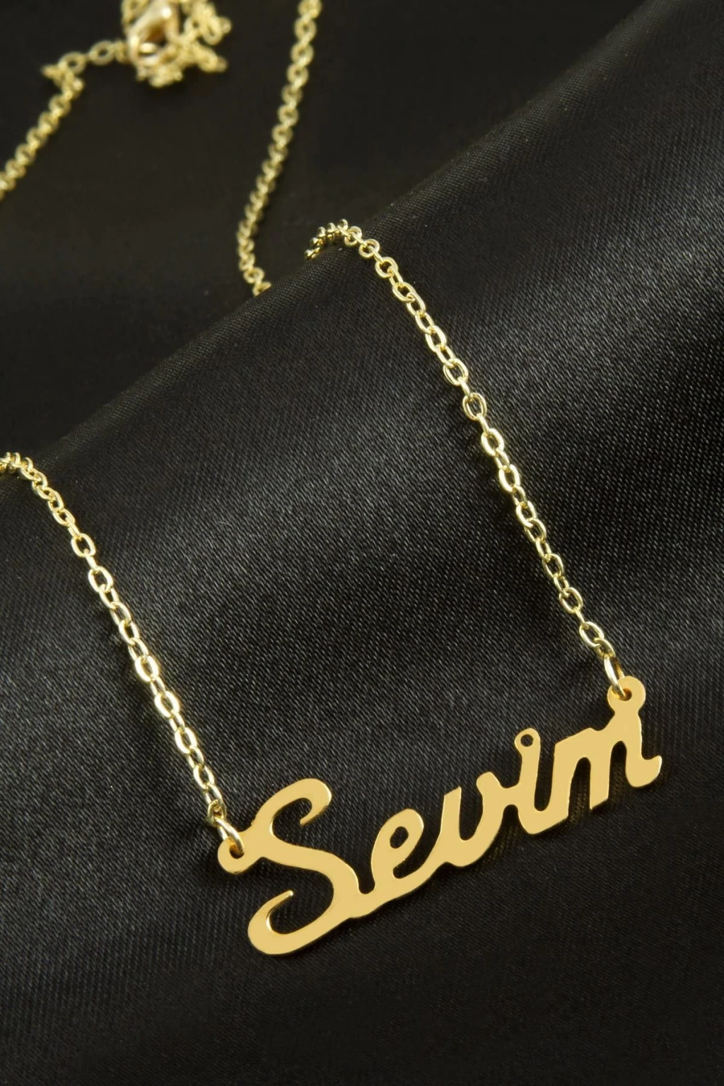 Sevim isimli kolye. İsimli kolye pirinç madeninden ve altın kaplamalıdır. Kişiye özel üretilmektedir.Yazdırmak istediğiniz ismi bize mesaj olarak iletmeniz gerekmektedir. Kullanıma bağlı olarak uzun süre kullanıma uygundur. Ürün malzemesi 1.sınıf kalitededir. Ürün ve zinciri sarı renktedir. Ürün zincir boyu 45 cm ve ürün üzerindeki isimler yaklaşık 3 cmdir. İsim boyları ürün ismine göre degişiklik göstermektedir.