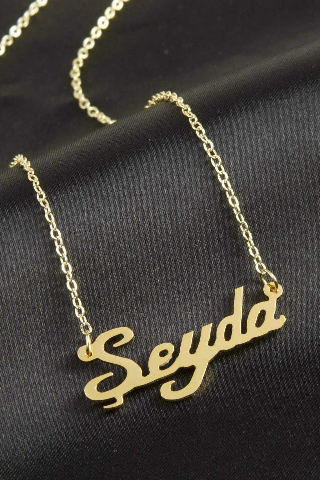 Şeyda isimli kolye. İsimli kolye pirinç madeninden ve altın kaplamalıdır. Kişiye özel üretilmektedir.Yazdırmak istediğiniz ismi bize mesaj olarak iletmeniz gerekmektedir. Kullanıma bağlı olarak uzun süre kullanıma uygundur. Ürün malzemesi 1.sınıf kalitededir. Ürün ve zinciri sarı renktedir. Ürün zincir boyu 45 cm ve ürün üzerindeki isimler yaklaşık 3 cmdir. İsim boyları ürün ismine göre degişiklik göstermektedir.