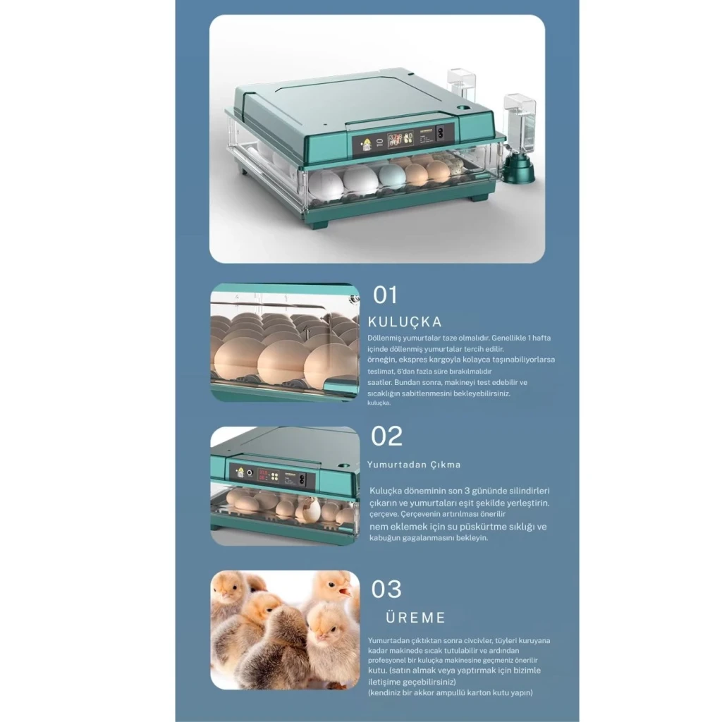 kuluçka makinesi, tam otomatik, 130 yumurta kapasiteli, portatif kuluçka cihazı, gün sayaçlı, otomatik yumurta çevirme, videolu kurulum, yedek motorlu kuluçka, civciv çıkarma makinesi, kaz ördek uyumlu kuluçka, yumurta çeviren makine