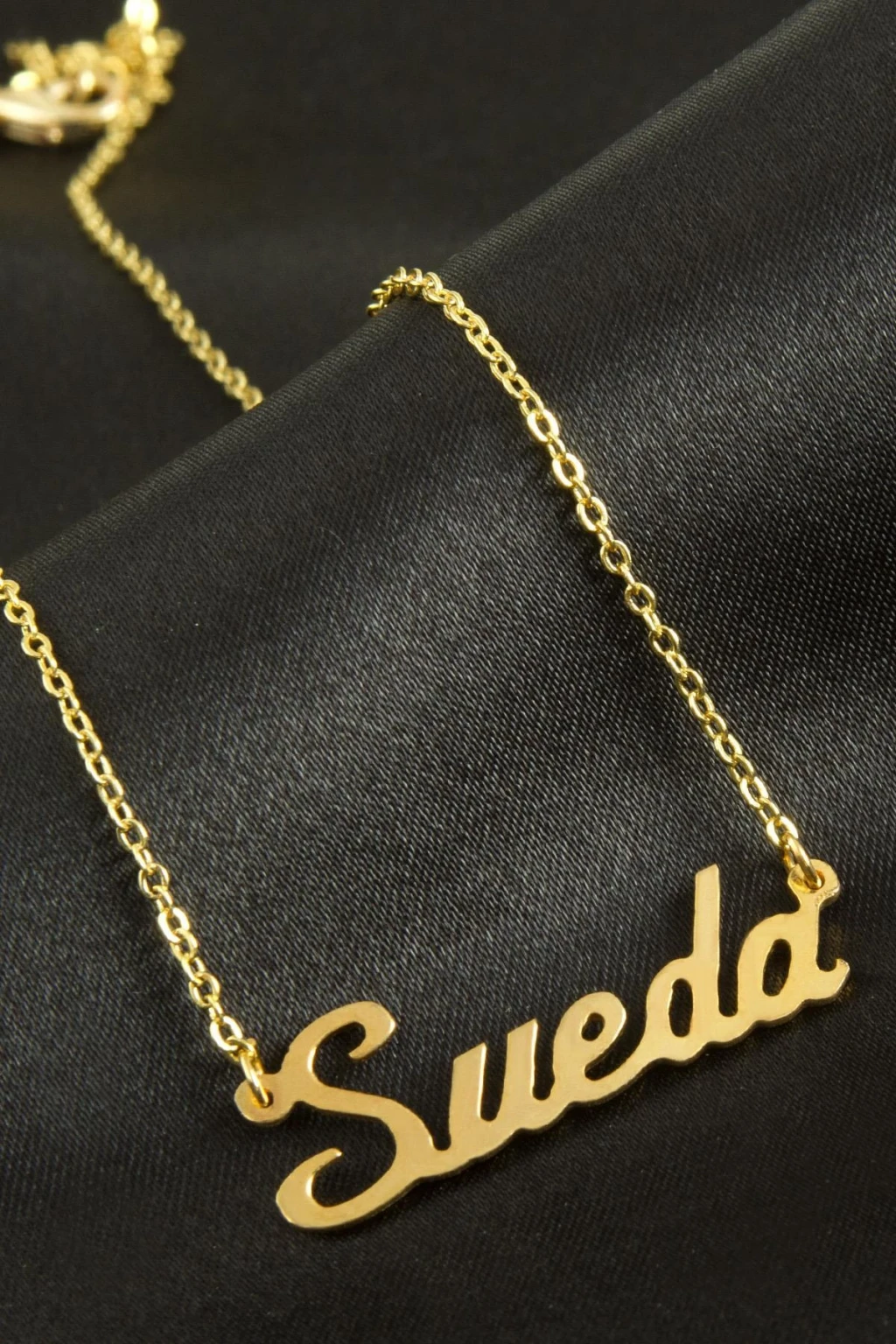 Sueda İsimli Kolye. İsimli kolye pirinç madeninden ve altın kaplamalıdır. Kişiye özel üretilmektedir.Yazdırmak istediğiniz ismi bize mesaj olarak iletmeniz gerekmektedir. Kullanıma bağlı olarak uzun süre kullanıma uygundur. Ürün malzemesi 1.sınıf kalitededir. Ürün ve zinciri sarı renktedir. Ürün zincir boyu 45 cm ve ürün üzerindeki isimler yaklaşık 3 cmdir. İsim boyları ürün ismine göre degişiklik göstermektedir.