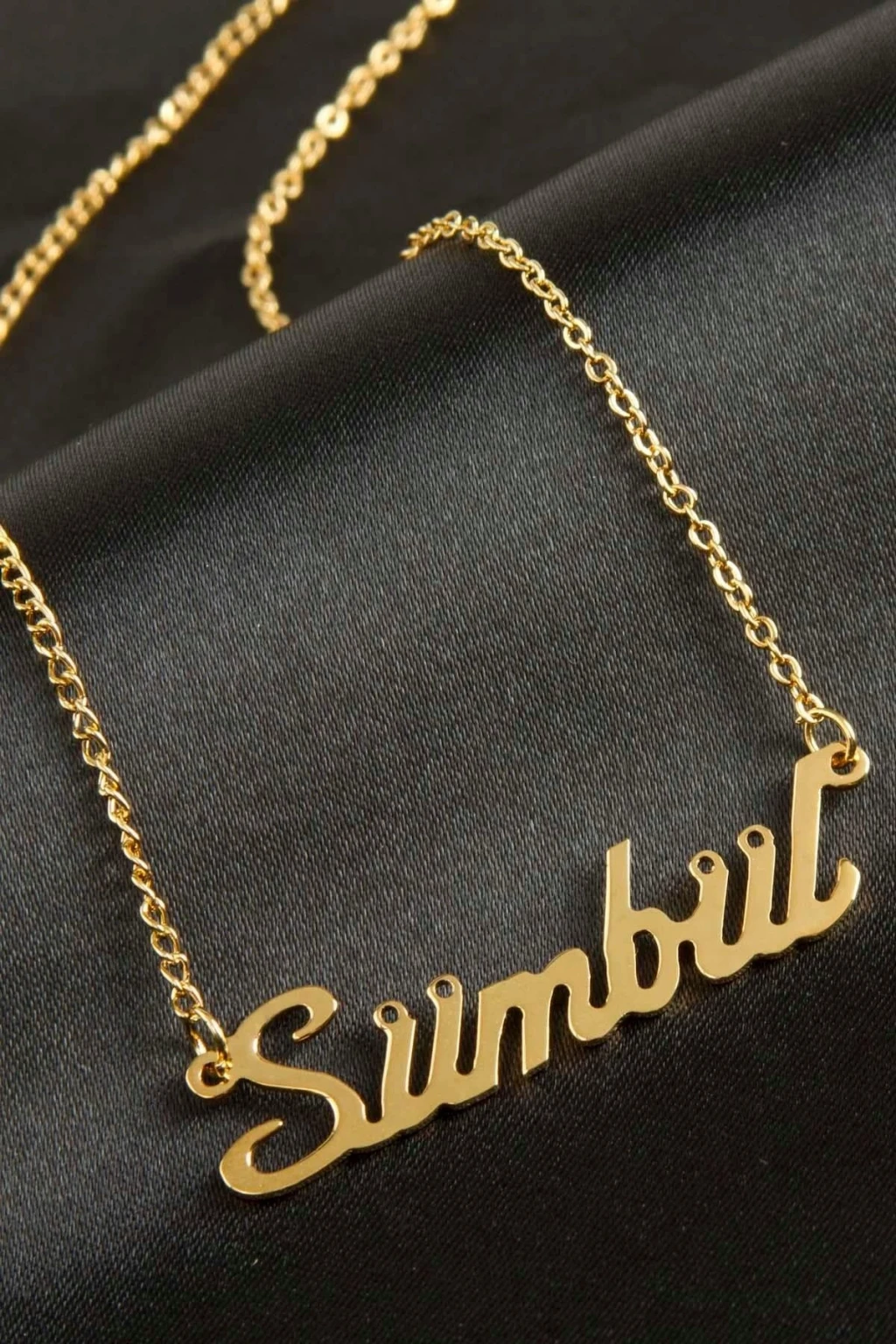 Sümbül İsimli Kolye. İsimli kolye pirinç madeninden ve altın kaplamalıdır. Kişiye özel üretilmektedir.Yazdırmak istediğiniz ismi bize mesaj olarak iletmeniz gerekmektedir. Kullanıma bağlı olarak uzun süre kullanıma uygundur. Ürün malzemesi 1.sınıf kalitededir. Ürün ve zinciri sarı renktedir. Ürün zincir boyu 45 cm ve ürün üzerindeki isimler yaklaşık 3 cmdir. İsim boyları ürün ismine göre degişiklik göstermektedir.