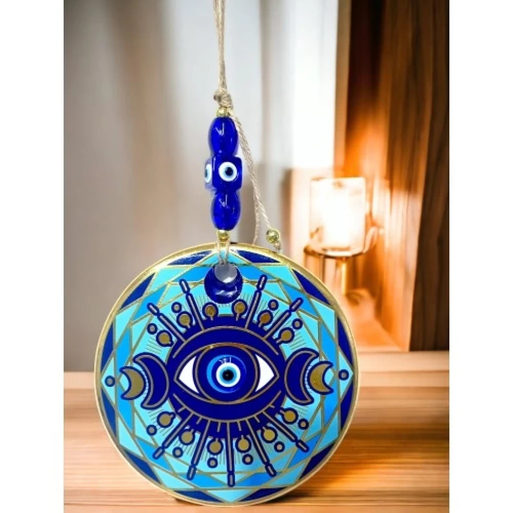 Nazar boncuklu göz duvar süsümüz nazar boncuğu ile süslenmiştir. Ürünümüz mavi cam nazar boncuğundan tamamen el işçiliği ile üretilmiştir. Ürünümüzün yuvarlak kısmı 13 santimetre çapındadır. Duvar süsümüz ip dahil yaklaşık 30 santimetre boyundadır.