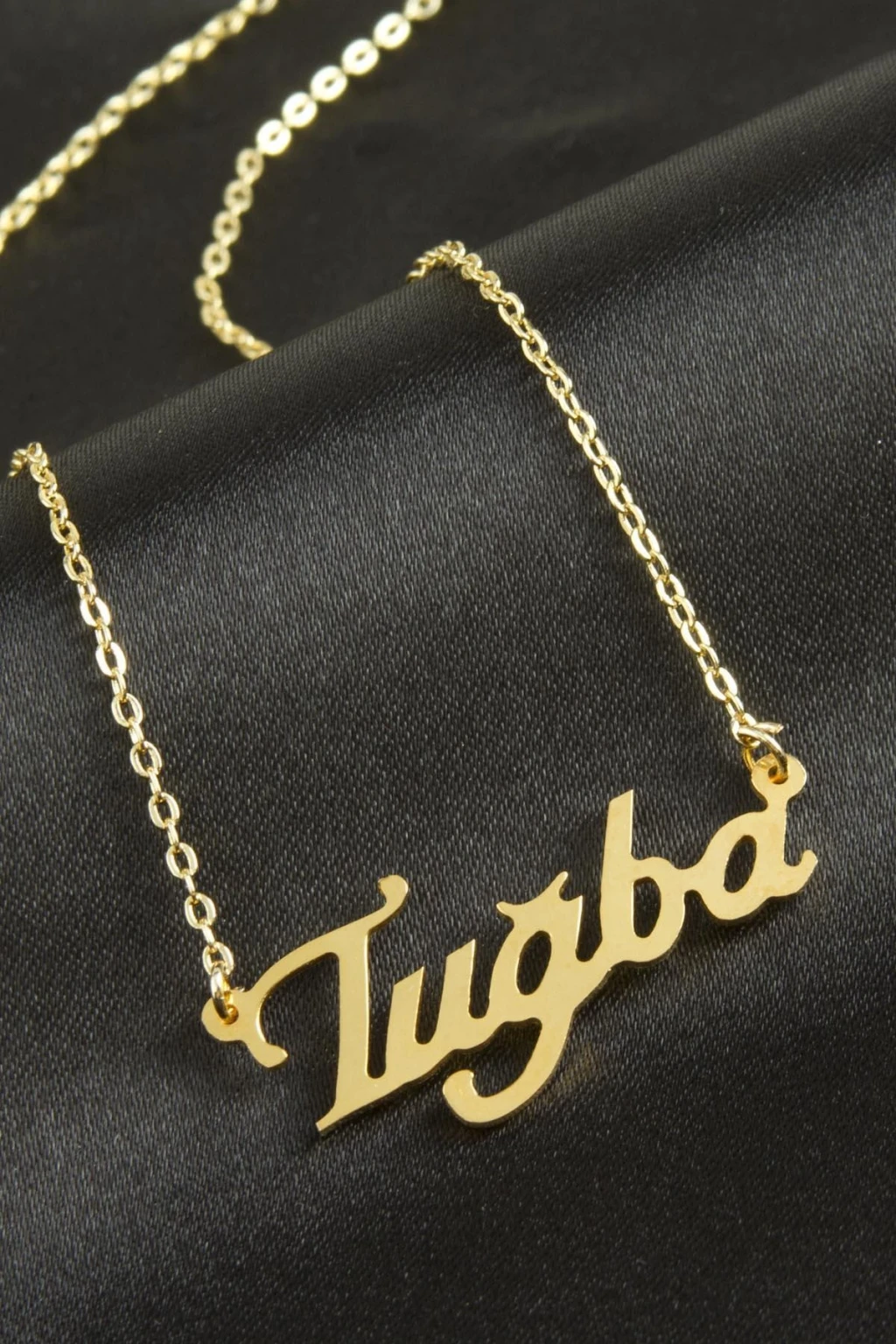 Tuğba İsimli Kolye. İsimli kolye pirinç madeninden ve altın kaplamalıdır. Kişiye özel üretilmektedir.Yazdırmak istediğiniz ismi bize mesaj olarak iletmeniz gerekmektedir. Kullanıma bağlı olarak uzun süre kullanıma uygundur. Ürün malzemesi 1.sınıf kalitededir. Ürün ve zinciri sarı renktedir. Ürün zincir boyu 45 cm ve ürün üzerindeki isimler yaklaşık 3 cmdir. İsim boyları ürün ismine göre degişiklik göstermektedir.