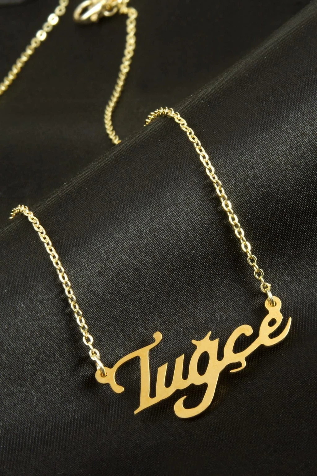 Tuğçe isimli kolye. İsimli kolye pirinç madeninden ve altın kaplamalıdır. Kişiye özel üretilmektedir.Yazdırmak istediğiniz ismi bize mesaj olarak iletmeniz gerekmektedir. Kullanıma bağlı olarak uzun süre kullanıma uygundur. Ürün malzemesi 1.sınıf kalitededir. Ürün ve zinciri sarı renktedir. Ürün zincir boyu 45 cm ve ürün üzerindeki isimler yaklaşık 3 cmdir. İsim boyları ürün ismine göre degişiklik göstermektedir.