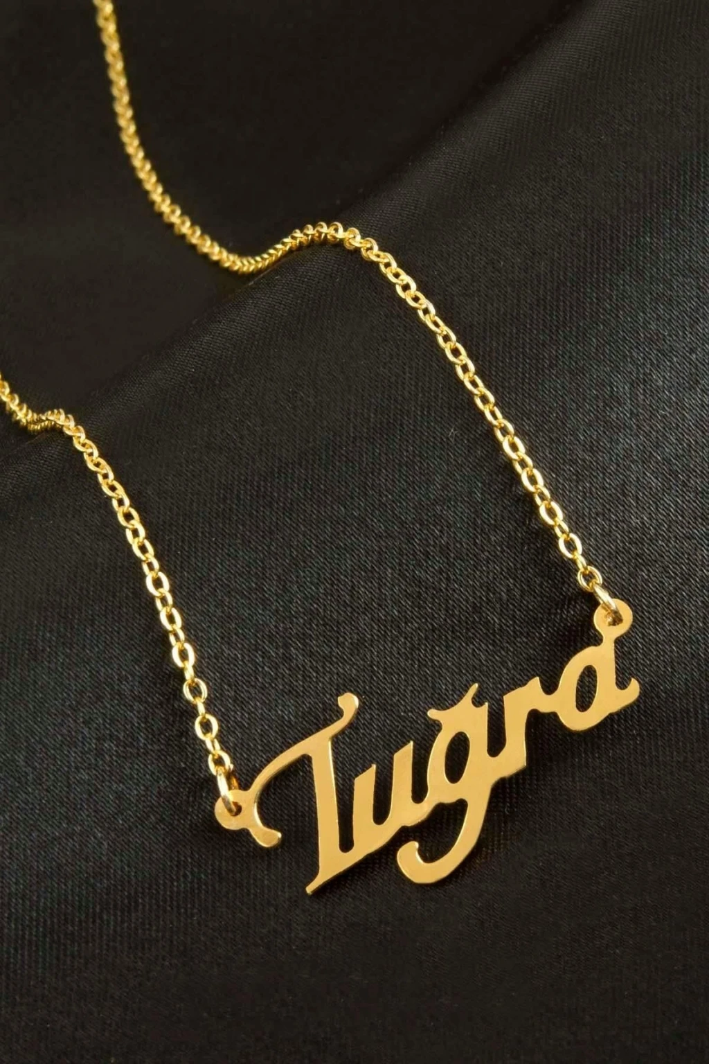 Tuğra İsimli Kolye. İsimli kolye pirinç madeninden ve altın kaplamalıdır. Kişiye özel üretilmektedir.Yazdırmak istediğiniz ismi bize mesaj olarak iletmeniz gerekmektedir. Kullanıma bağlı olarak uzun süre kullanıma uygundur. Ürün malzemesi 1.sınıf kalitededir. Ürün ve zinciri sarı renktedir. Ürün zincir boyu 45 cm ve ürün üzerindeki isimler yaklaşık 3 cmdir. İsim boyları ürün ismine göre degişiklik göstermektedir.