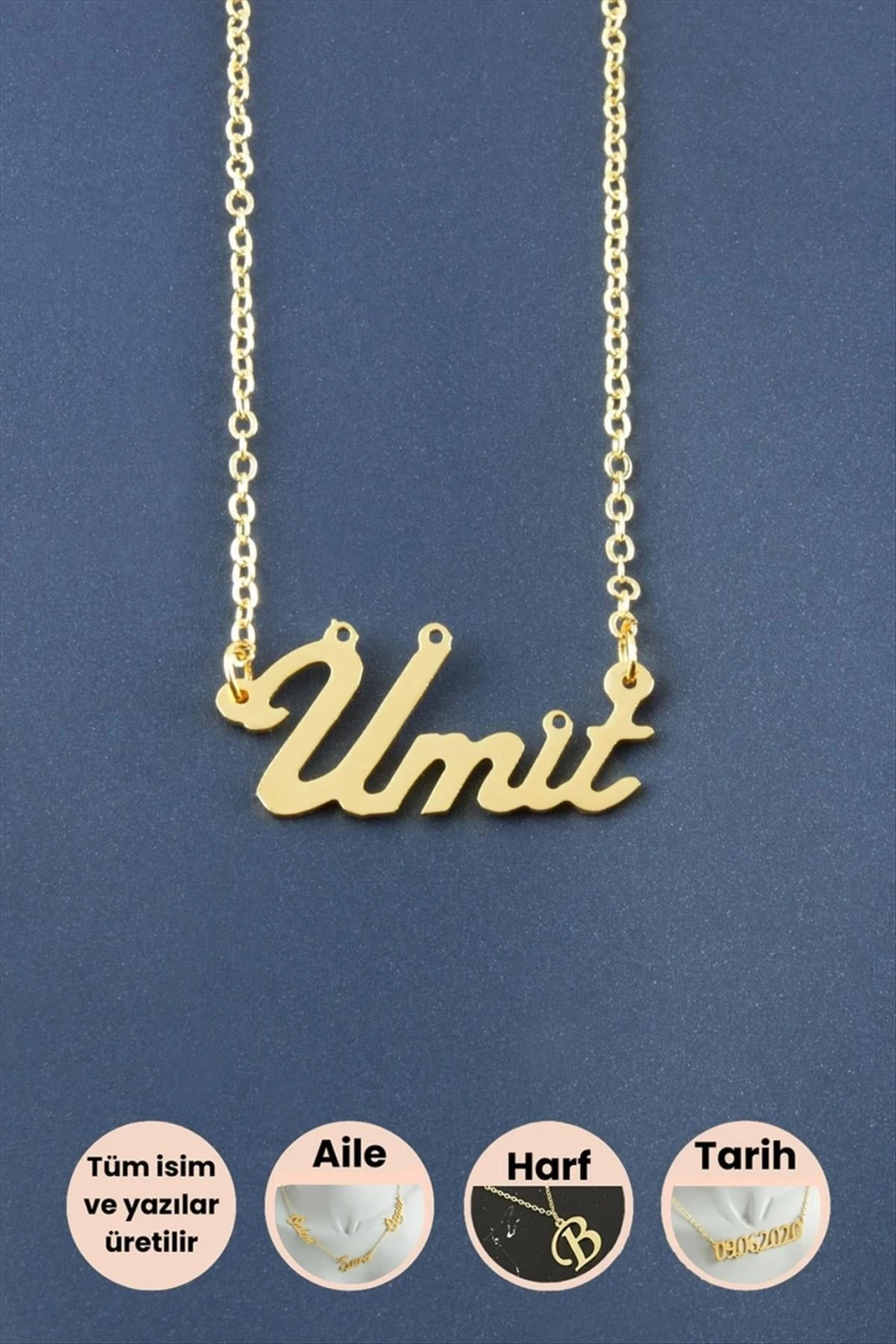 Ümit İsimli Kolye; İsimli kolye pirinç madeninden ve altın kaplamalıdır. Kişiye özel üretilmektedir. Yazdırmak istediğiniz ismi bize mesaj olarak iletmeniz gerekmektedir. Kullanıma bağlı olarak uzun süre kullanıma uygundur. Ürün malzemesi 1.sınıf kalitededir. Ürün ve zinciri sarı renktedir. Ürün zincir boyu 45 cm ve ürün üzerindeki isimler yaklaşık 3 cmdir. İsim boyları ürün ismine göre degişiklik göstermektedir.