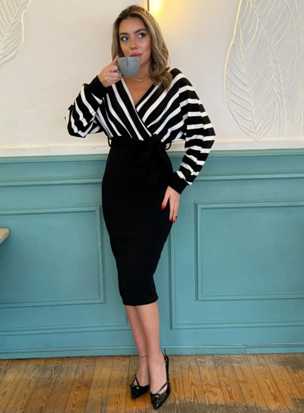 Uzun Kollu Kruvaze Yaka çizgi Desenli Kısa Triko Elbise