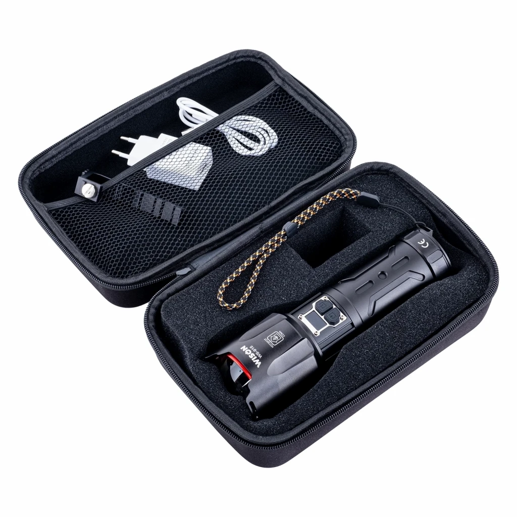 Wison El Feneri, yüksek gücü, dayanıklı yapısı ve uzun ömürlü şarj kapasitesi ile profesyonel kullanıcılar ve macera tutkunları için en iyi seçimasma imkanı için askı aparatı bulunur.