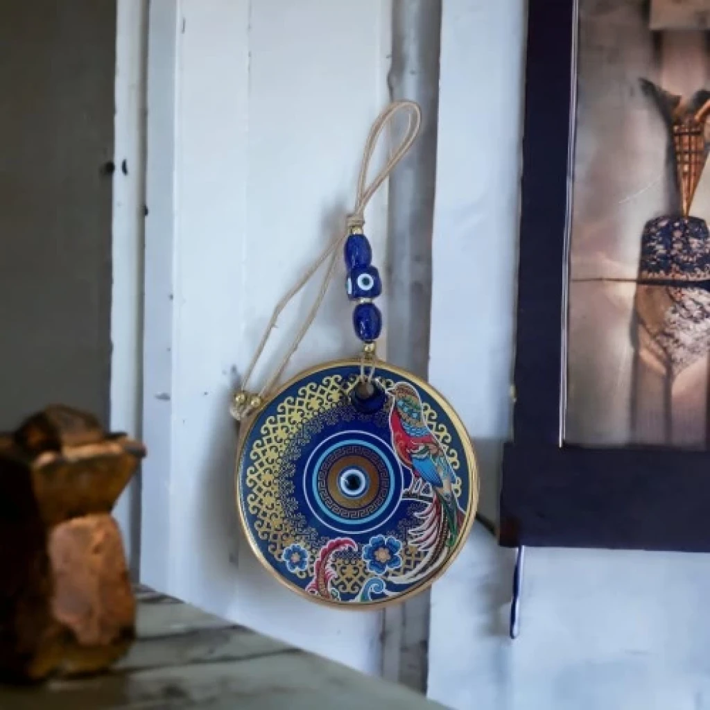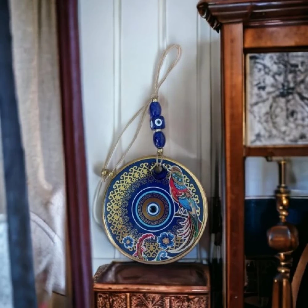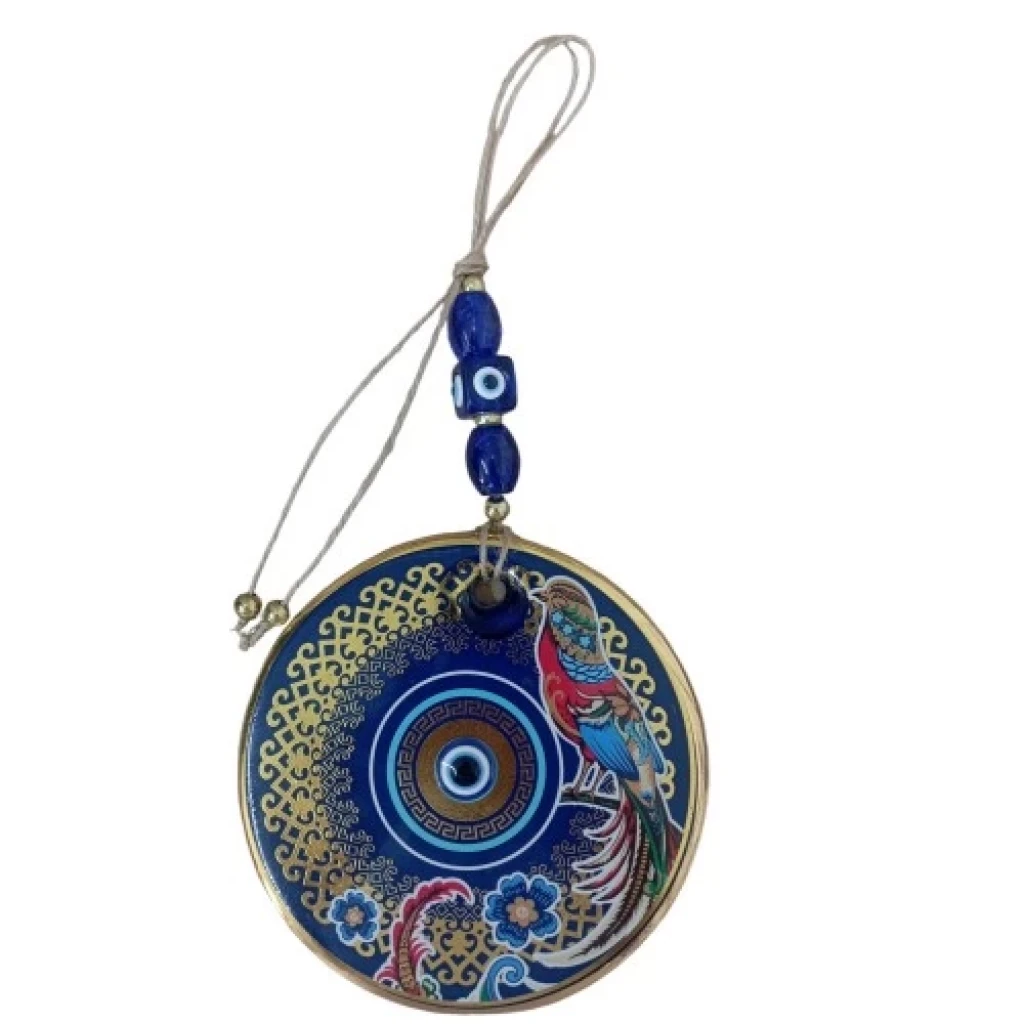 Altın rengi kaplamalı duvar süsümüz nazar boncuğu ile süslenmiştir. Ürünümüz mavi cam nazar boncuğundan tamamen el işçiliği ile üretilmiştir. Ürünümüzün yuvarlak kısmı 13 santimetre çapındadır. Duvar süsümüz ip dahil yaklaşık 30 santimetre boyundadır.