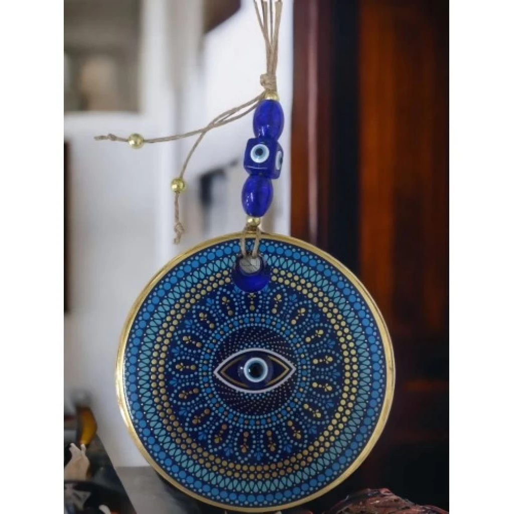 Nazar boncuklu göz duvar süsümüz nazar boncuğu ile süslenmiştir. Ürünümüz mavi cam nazar boncuğundan tamamen el işçiliği ile üretilmiştir. Ürünümüzün yuvarlak kısmı 13 santimetre çapındadır. Duvar süsümüz ip dahil yaklaşık 30 santimetre boyundadır.