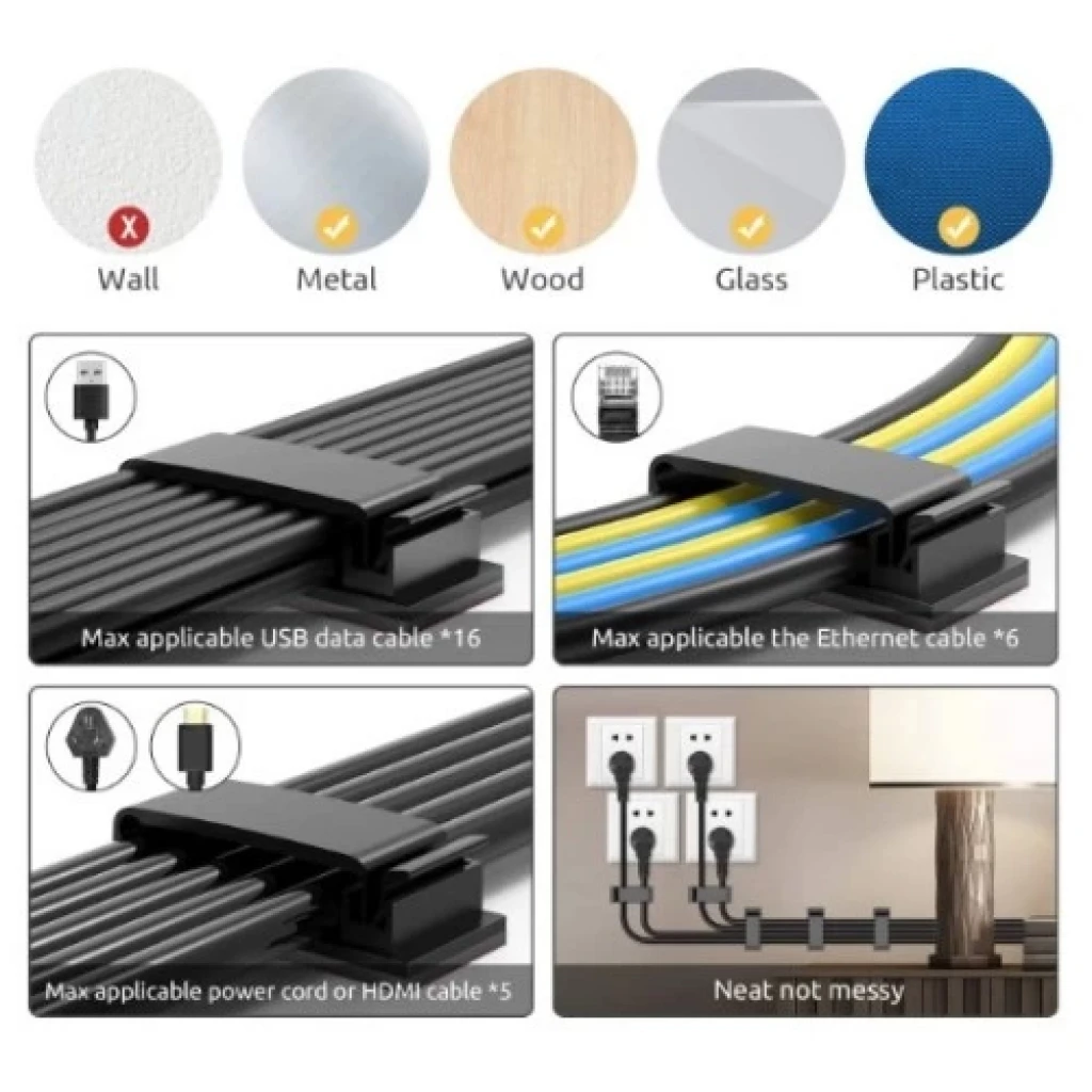 YAPIŞKANLI KABLO DÜZENLEYİCİ SET Plastik malzeme güçlü ve dayanıklıdır.Kabloları düzenlerken masaüstünün görünümünü etkilemez.Dağınık kabloların yönetilmesine ve daha rahat kullanılmasına izin verir.Yüksek kaliteli yapışkan bant kullanarak, cam, ahşap, seramik fayans ve diğer malzemeler üzerinde kullanılabilir.Paket içeriği : 4 Adet Yapışkanlı Kablo Düzenleyici KlipsRenk : SiyahÖlçüler : 19*11.4*45mm