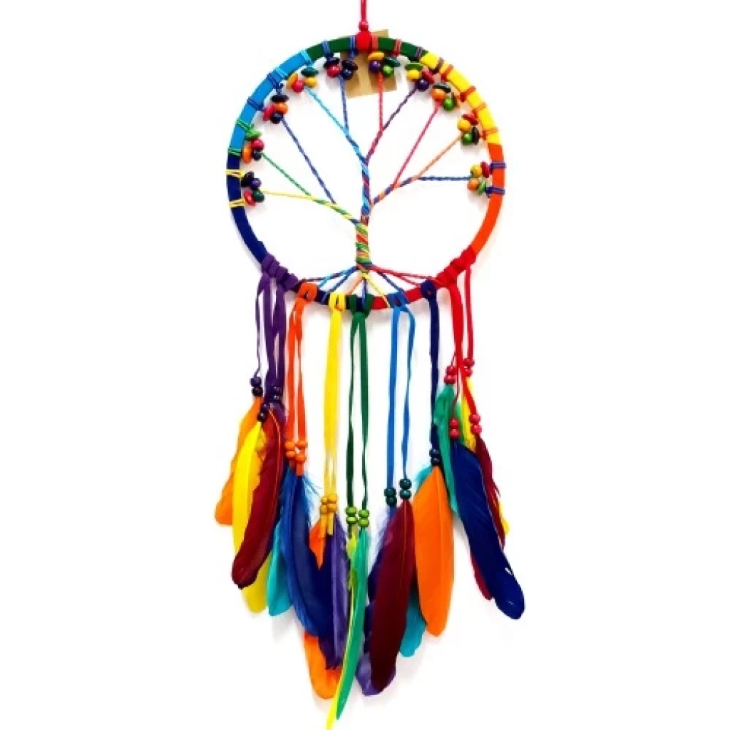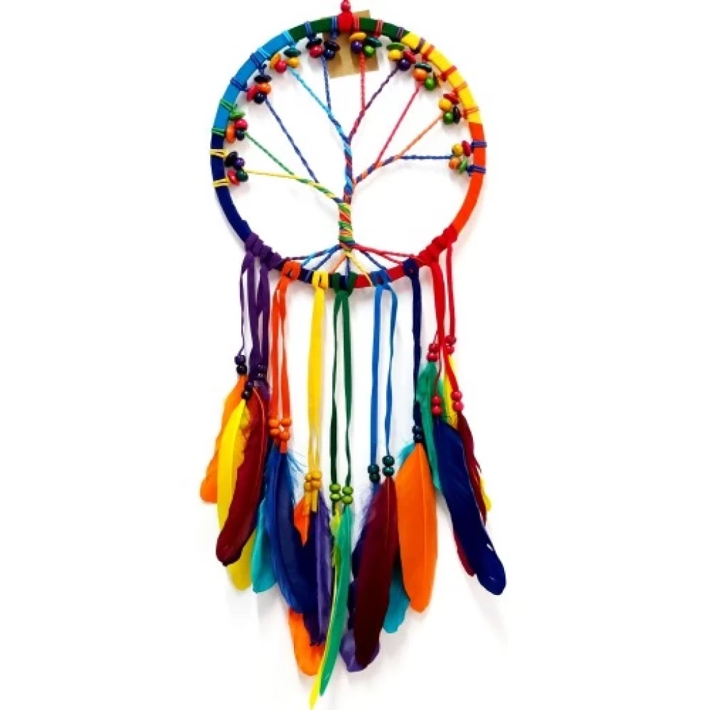 Yedi çakra düş kapanı hayat ağacı ürünümüz rengarenk boncuklardan ve kuş tüyünden tamamen el işçiliği ile üretilmiştir. Ürünümüz 23 santimetre eninde, 60 santimetre boyundadır.