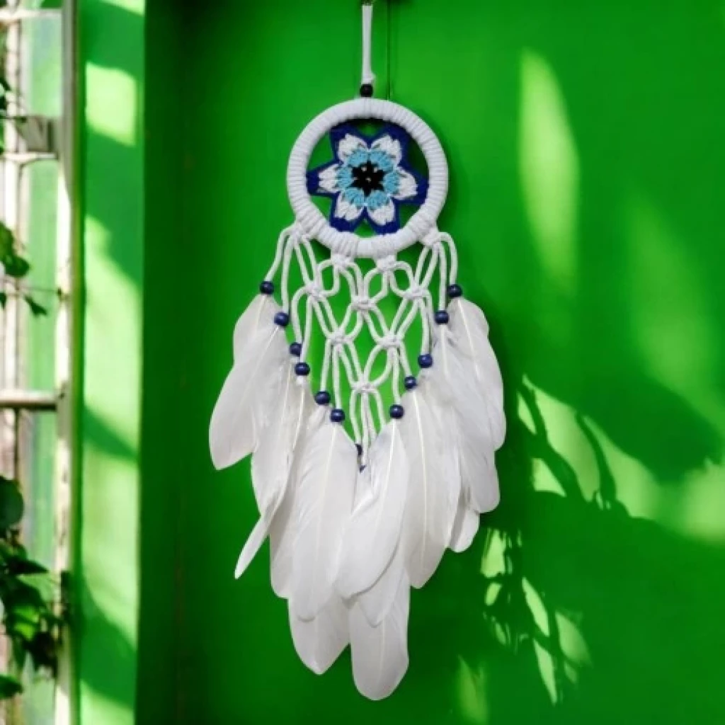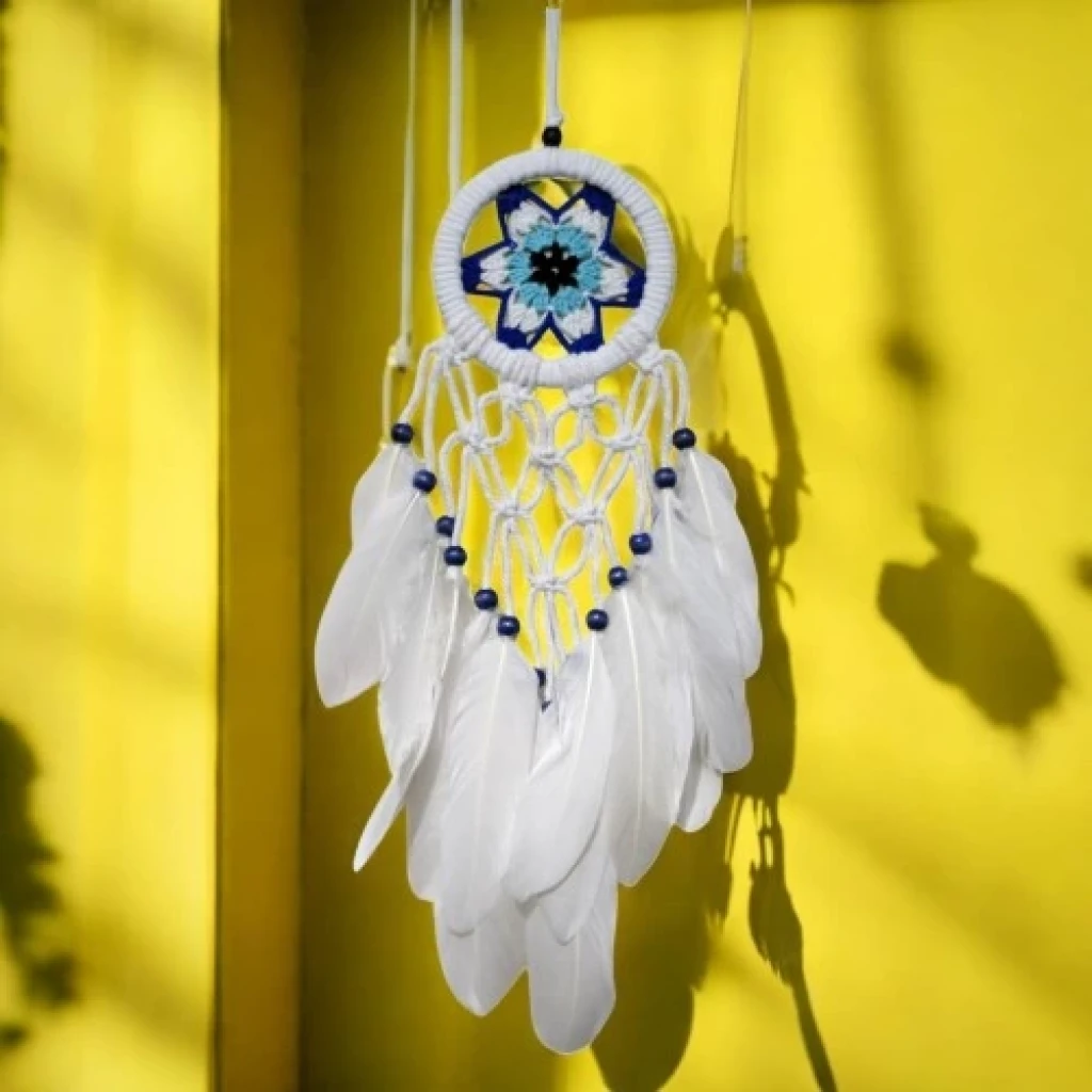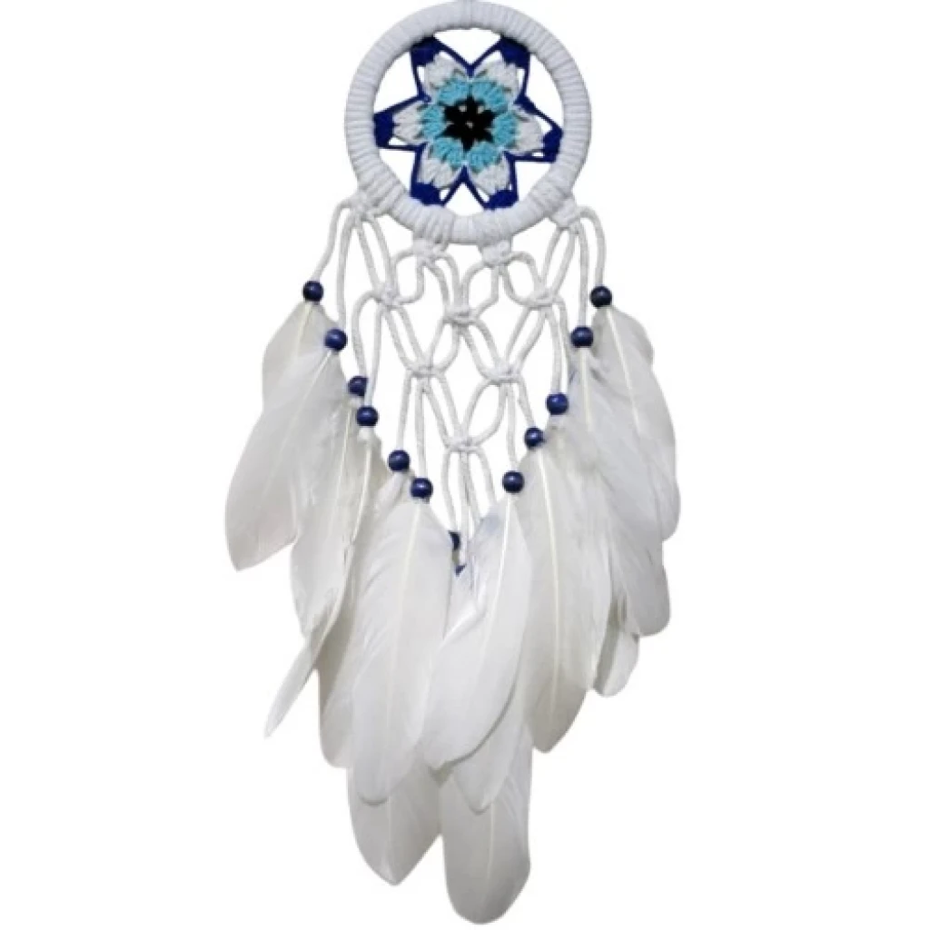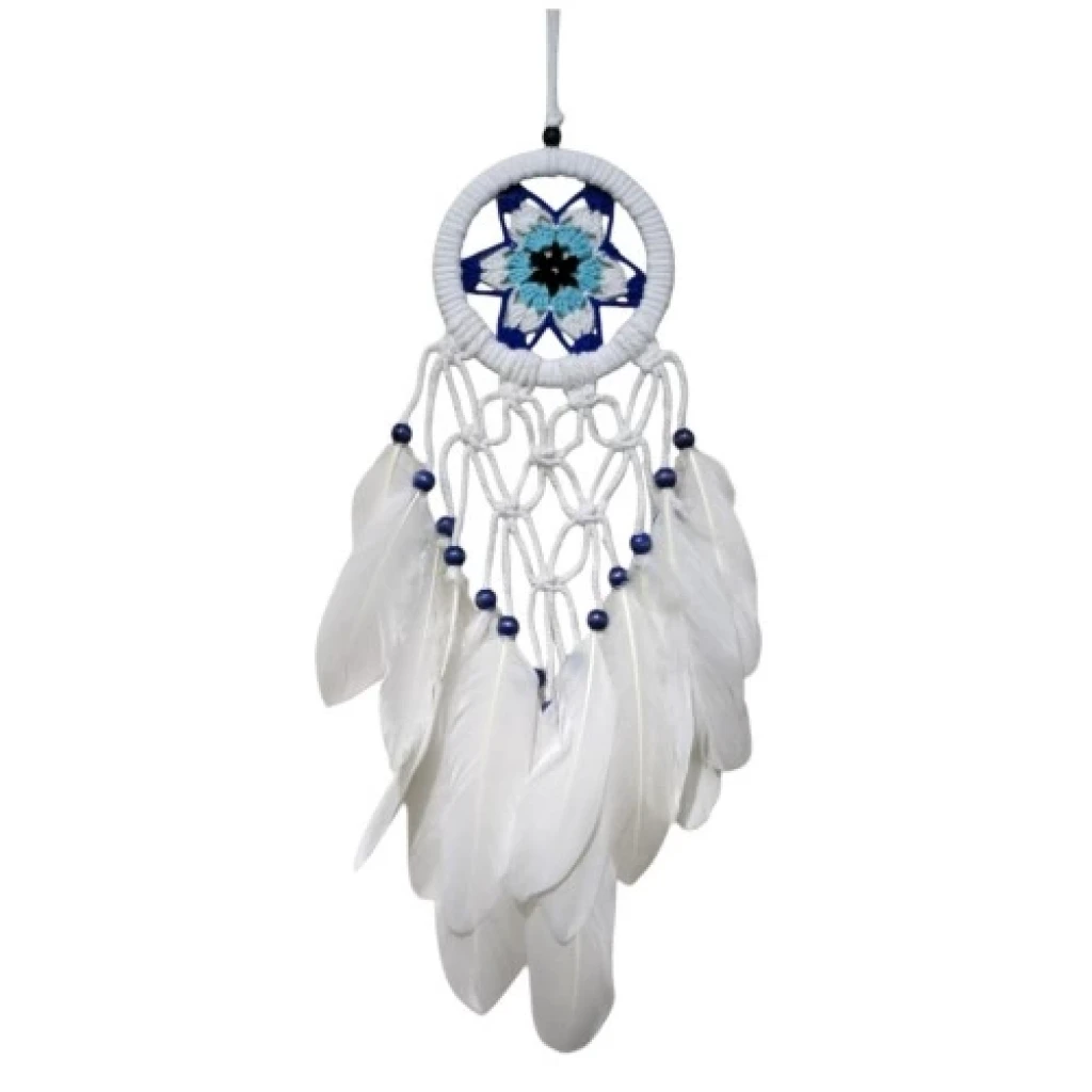 Duvar süsümüzün ortasında Nazarlık renklerinde yıldız şekli bulunmaktadır. Kuş tüyleri ile süslenmiş olan ürünümüzün yuvarlak kısmı 12 santimetre çapındadır. Ürünümüz ip dahil yaklaşık 53 santimetre boyundadır.