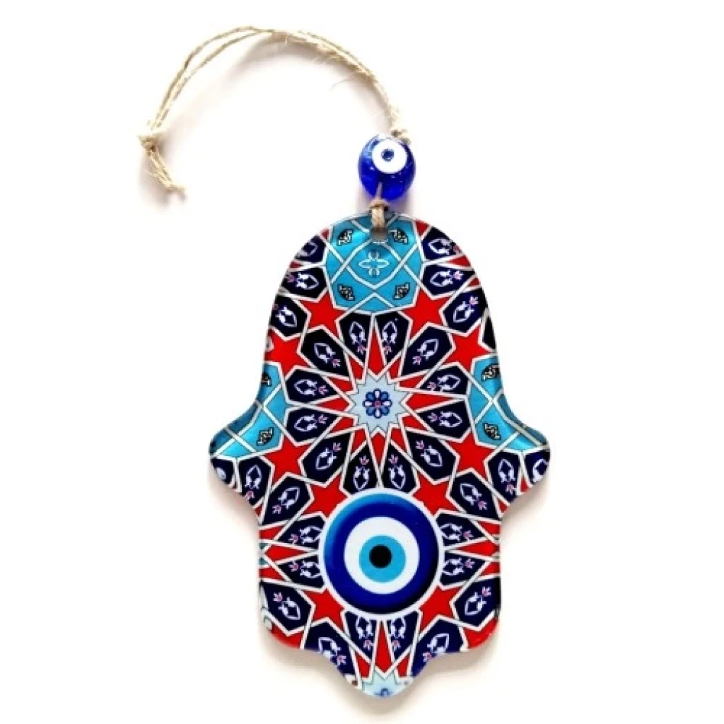 Nazar boncuğu ve yıldız desenli Fatma Ana bereket elimiz füzyon cam malzeme kullanılarak üretilmektedir. Duvar süsümüz 11 santimetre eninde, 16 santimetre boyundadır. Ürünümüz ip dahil 33 santimetre boyundadır.