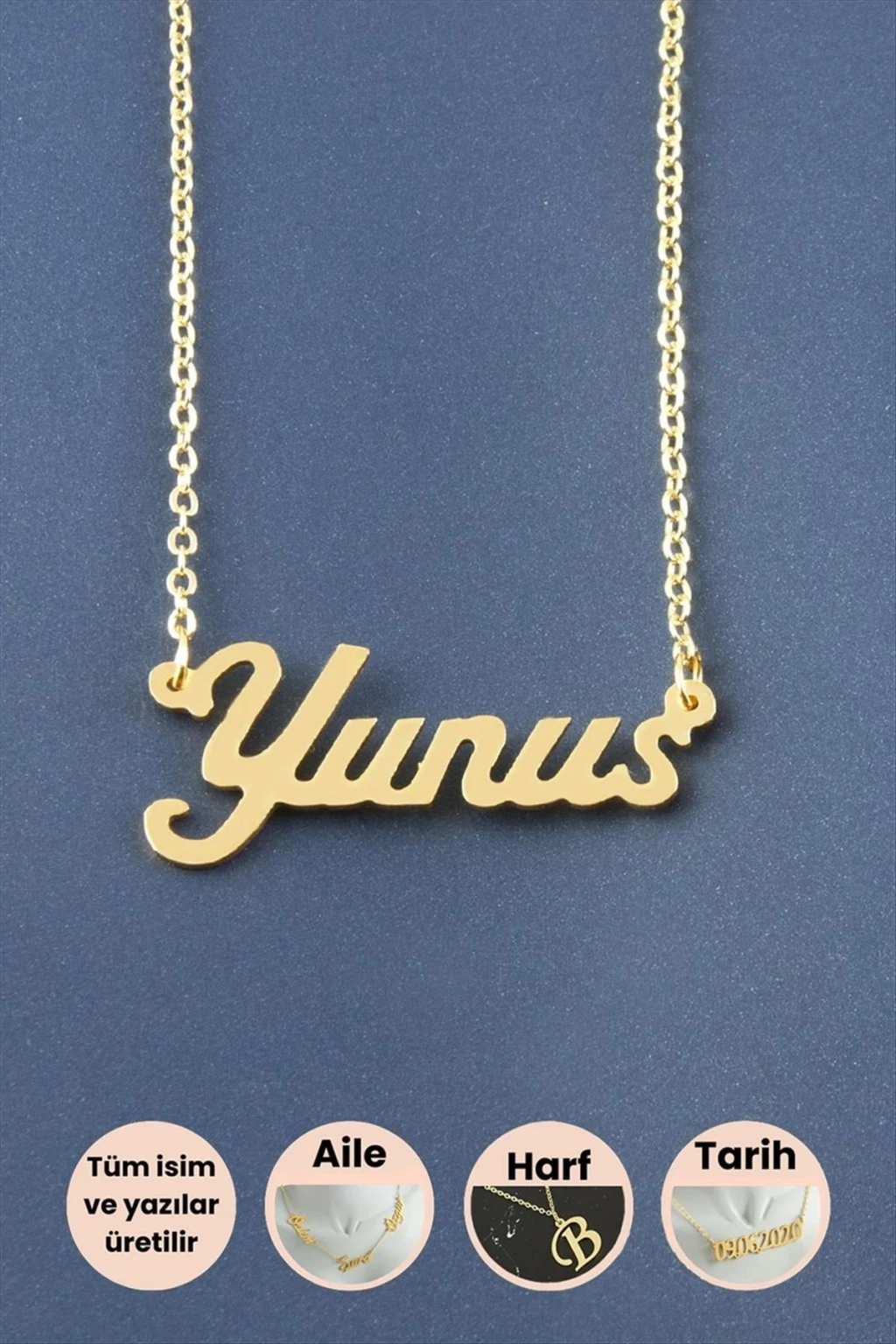 Yunus İsimli Kolye; İsimli kolye pirinç madeninden ve altın kaplamalıdır. Kişiye özel üretilmektedir. Yazdırmak istediğiniz ismi bize mesaj olarak iletmeniz gerekmektedir. Kullanıma bağlı olarak uzun süre kullanıma uygundur. Ürün malzemesi 1.sınıf kalitededir. Ürün ve zinciri sarı renktedir. Ürün zincir boyu 45 cm ve ürün üzerindeki isimler yaklaşık 3 cmdir. İsim boyları ürün ismine göre degişiklik göstermektedir.