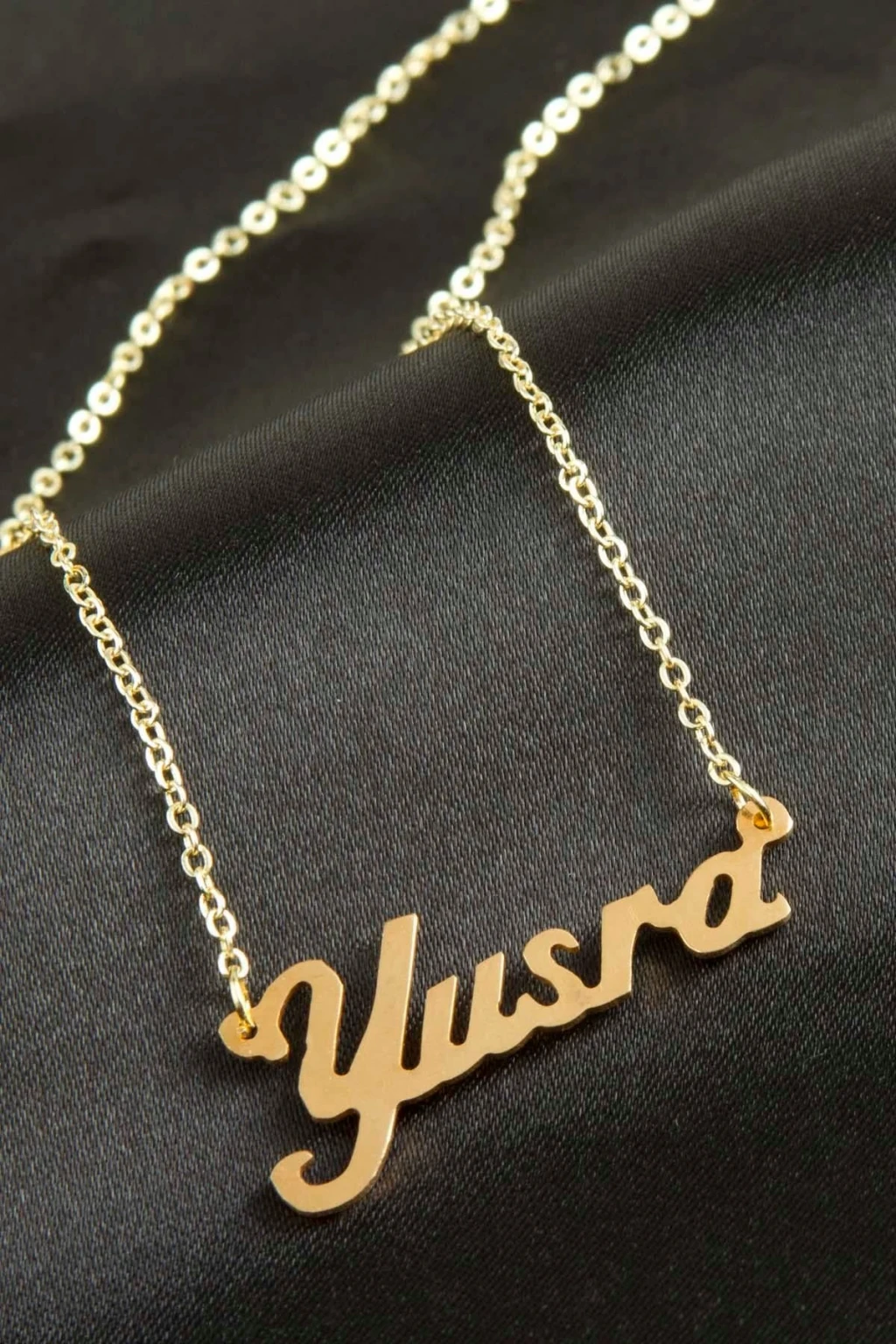 Yusra İsimli Kolye. İsimli kolye pirinç madeninden ve altın kaplamalıdır. Kişiye özel üretilmektedir.Yazdırmak istediğiniz ismi bize mesaj olarak iletmeniz gerekmektedir. Kullanıma bağlı olarak uzun süre kullanıma uygundur. Ürün malzemesi 1.sınıf kalitededir. Ürün ve zinciri sarı renktedir. Ürün zincir boyu 45 cm ve ürün üzerindeki isimler yaklaşık 3 cmdir. İsim boyları ürün ismine göre degişiklik göstermektedir.